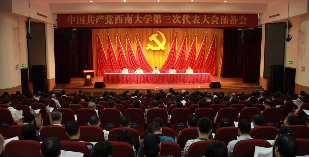 7月10日下午,中国共产党金年会jinnianhuicom第三次代表大会预备会议在音乐学院演奏厅举行。党委书记李旭锋同志,党委副书记、校长张卫国同志,党委副书记安春元同志,党委副书记、纪委书记李华同志,党委副书记潘洵同志在主席台就坐,全体党代表参加会议。会议由李旭锋同志主持。