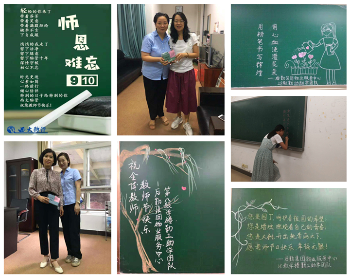 物业服务中心组织勤工助学学生在10栋公共教学楼、300余间教室的黑板上书写祝福语,并由工作人员向当天上课的教师赠送精心准备的小礼物。接收到祝福的老师们纷纷称赞中心每年准备的小礼物好看实用,有的老师随手还掏出了前年教师节收到的钥匙包,觉得非常贴心。