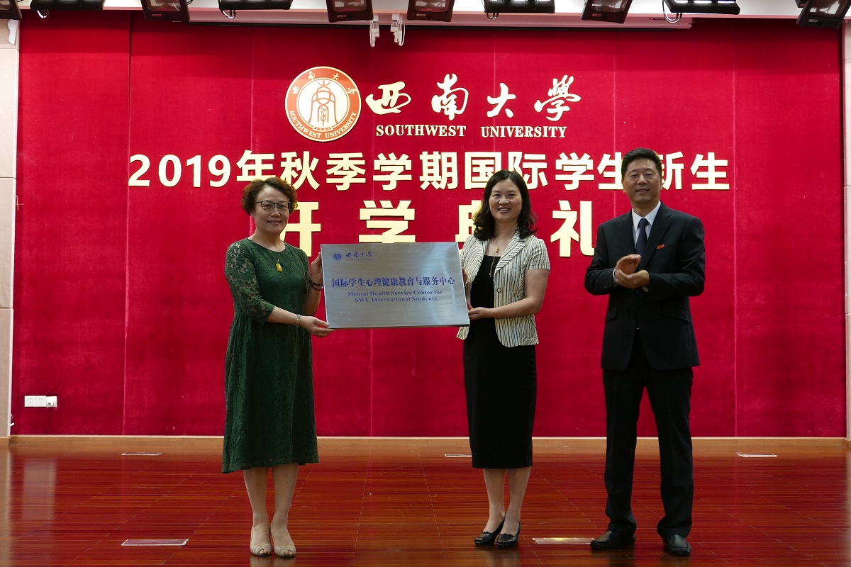 为帮助国际学生新生尽快适应新的学习生活环境,帮助学生克服文化差异带来的困难,促进学生身心全面和谐发展,国际学院和心理学部共建“国际学生心理健康教育与服务中心”,典礼上,靳玉乐副校长向国际学院和心理学部两个共建单位授牌。
