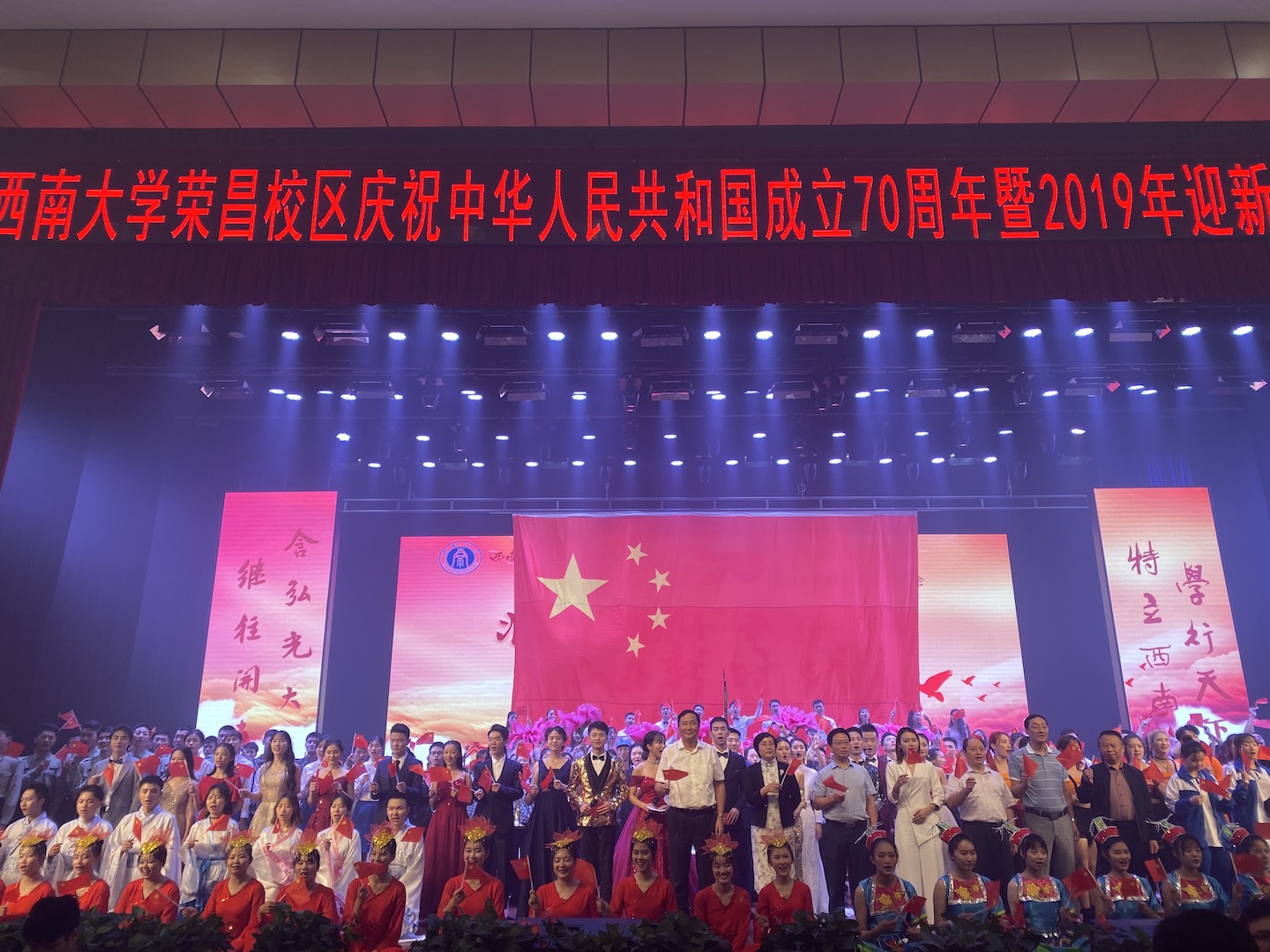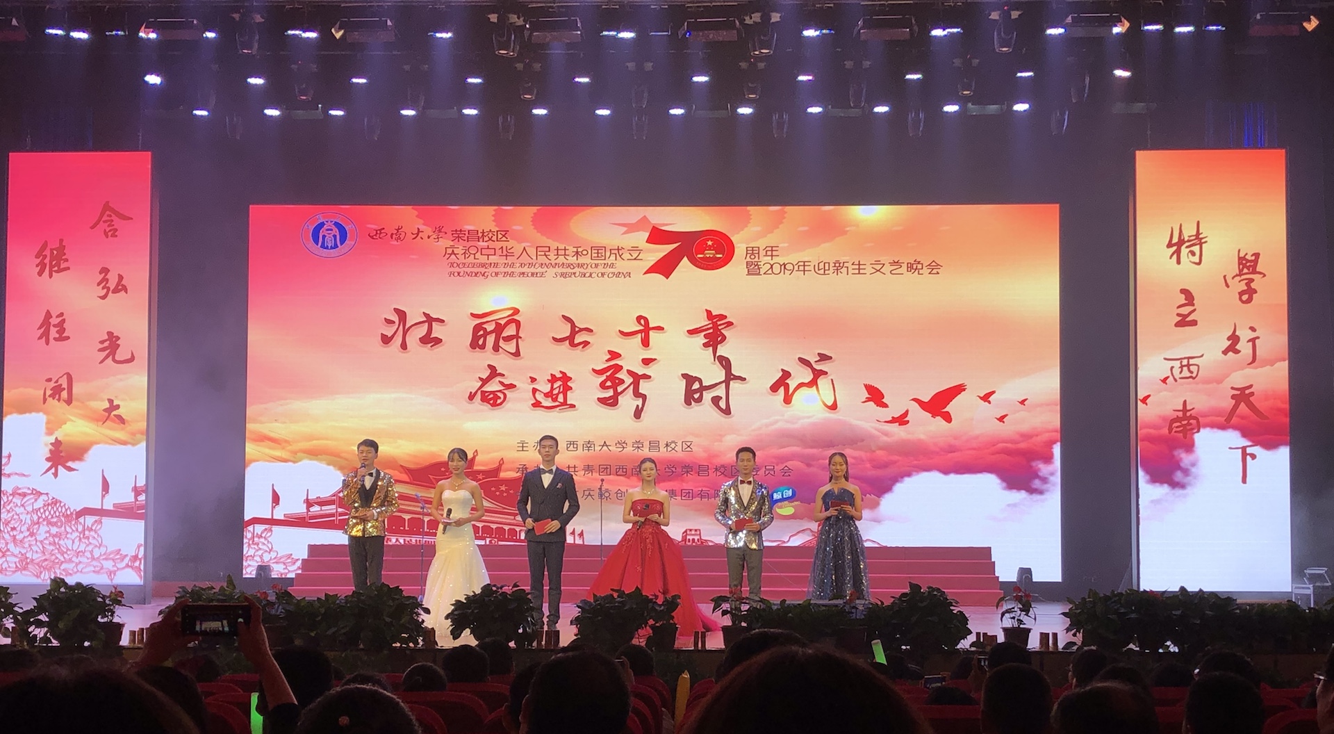 70年励精图治,叠浪潮涌,我们不忘初心;70年时光飞渡,岁月如歌,我们牢记使命。9月28日,“壮丽七十年,奋进新时代---金年会jinnianhuicom荣昌校区庆祝中华人民共和国成立70周年暨2019年迎新生文艺晚会”在校区新活动中心举行。荣昌区委副书记黄晏、荣昌区相关职能部门、学校相关职能部门、荣昌校区、动物科学学院、商贸学院、荣昌校区基础部、荣昌校区各职能部门主要负责同志出席晚会,校区2019级新生共计1300余人参加晚会。