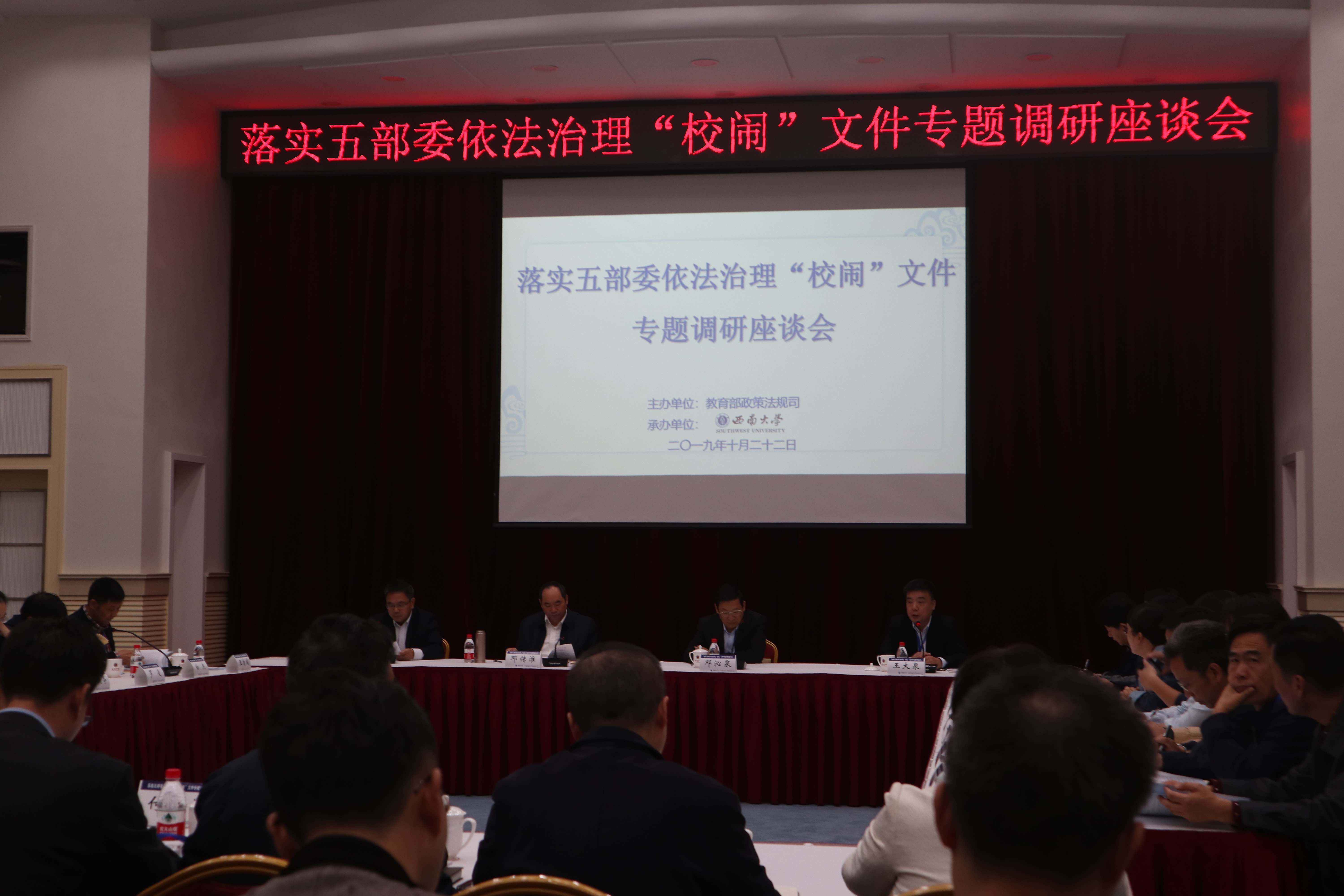 10月22日,由教育部政策法规司主办、金年会jinnianhuicom承办的落实五部委依法治理“校闹”文件专题调研座谈会在校举行。教育部政策法规司司长邓传淮、学校副校长陈时见、重庆市教委副主任邓沁泉出席会议并致辞。教育部政策法规司副司长王大泉主持调研座谈会。