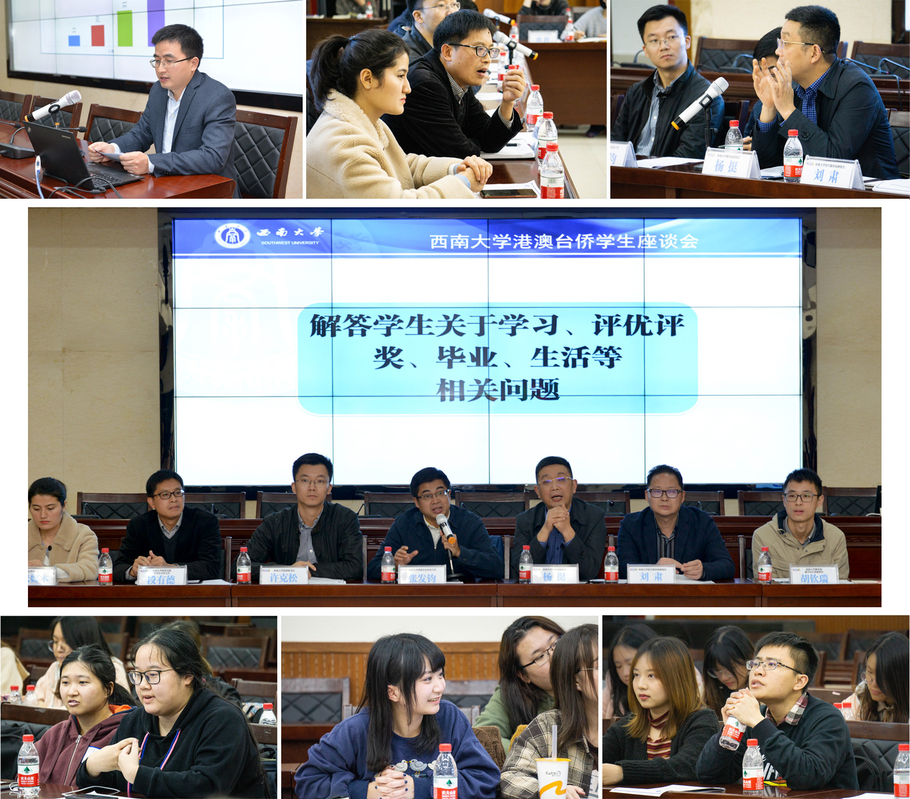 座谈会上,陈炳君副主任解读了学校关于港澳台侨学生的职能划分和管理政策;教务处杨挺副处长等分别就课程设置、选课方法进行了讲解;各相关职能部门负责人就学生们提出相关问题进行逐一解答,为同学们学习规划和职业生涯提出建议。