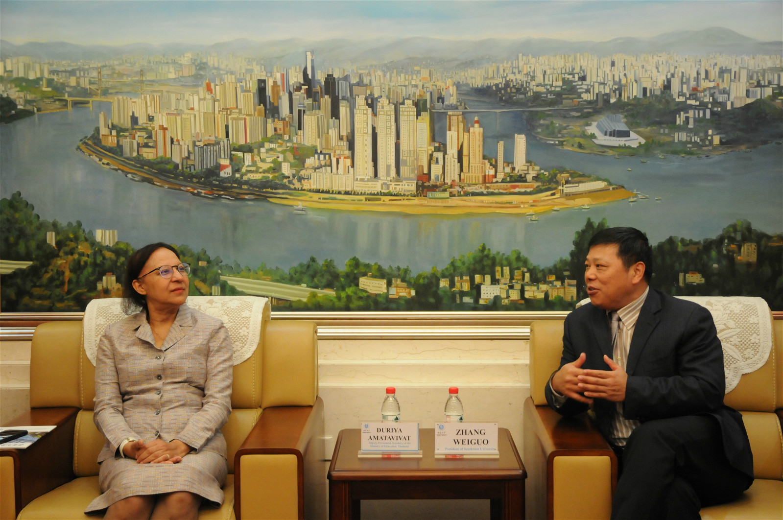 校长办公室、国际学院相关负责人参加会见。会后,杜丽亚女士一行与国际学院和教育学部负责人座谈,就泰国教育官员及校长培训项目交换了意见,并就进一步推进双边合作进行了讨论。杜丽亚女士一行还访问了重庆市教委,参加了2019年重庆市长奖学金丝路项目---“泰国教育官员及校长培训”结业典礼。