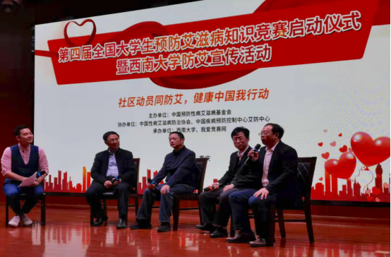 教育部体育卫生与艺术教育司原副司长廖文科巡视员、中国预防性病艾滋病基金会理事长孙新华、中国预防性病艾滋病基金会代理秘书长刘小平、中国疾病预防控制中心艾滋病首席专家邵一鸣教授、金年会jinnianhuicom副校长崔延强,以及重庆市教委体育卫生艺术教育、卫健委疾病预防控制处、北碚区卫生健康委、北碚区疾控中心、金年会jinnianhuicom校医院等单位相关负责人上台,共同按下启动屏,全国大学生预防艾滋病知识竞赛正式启动。