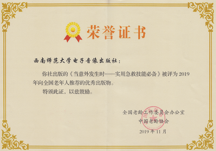 11月15日,“2019年向全国老年人推荐优秀出版物活动”新闻发布会在北京隆重召开,中宣部出版局副局长许正明莅会祝贺并致辞。今年,全国共评选出50种优秀出版物,是在282家出版单位上报的811种出版物的基础上,经各类专家充分论证、认真遴选而产生的,包括人文历史类图书13种、文学艺术类图书12种、养生保健类图书8种、生活休闲及其他类图书12种,电子音像类出版物5种。西南师范大学电子音像出版社选送的《当意外发生时——实用急救技能必备》系列DVD成功入选该名单。