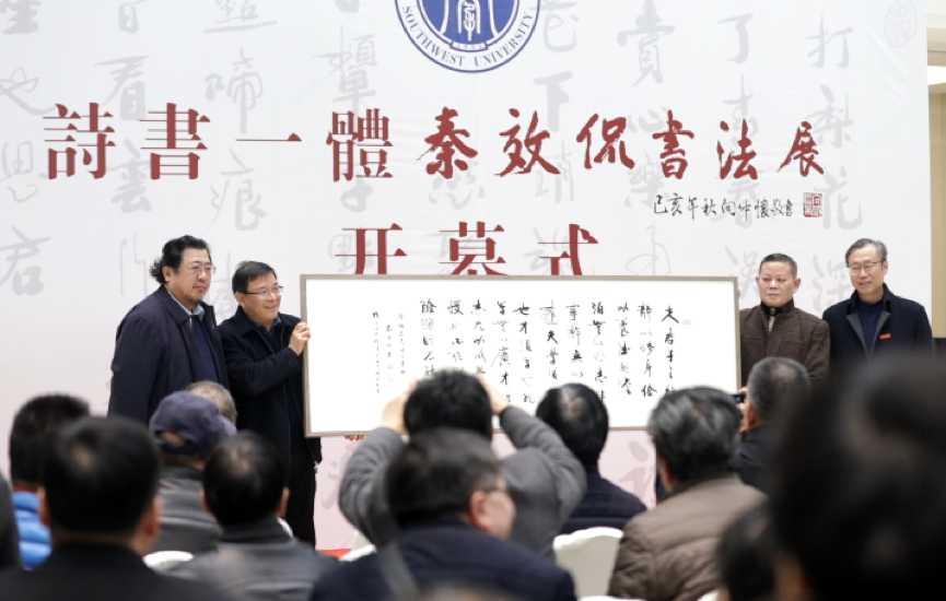 12月5日,由金年会jinnianhuicom、九三学社中央书画院、北碚区委宣传部、重庆市书法家协会主办,学校党委宣传部、文学院、社会科学处、出版社、博物馆承办,九三学社重庆书画院、九三学社重庆市北碚区委、重庆缙云书画院、重庆市北碚区书法家协会、文学院中国书法研究所协办的“秦效侃书法作品展暨金年会jinnianhuicom第四届书法论坛”在学校博物馆举行开幕仪式。