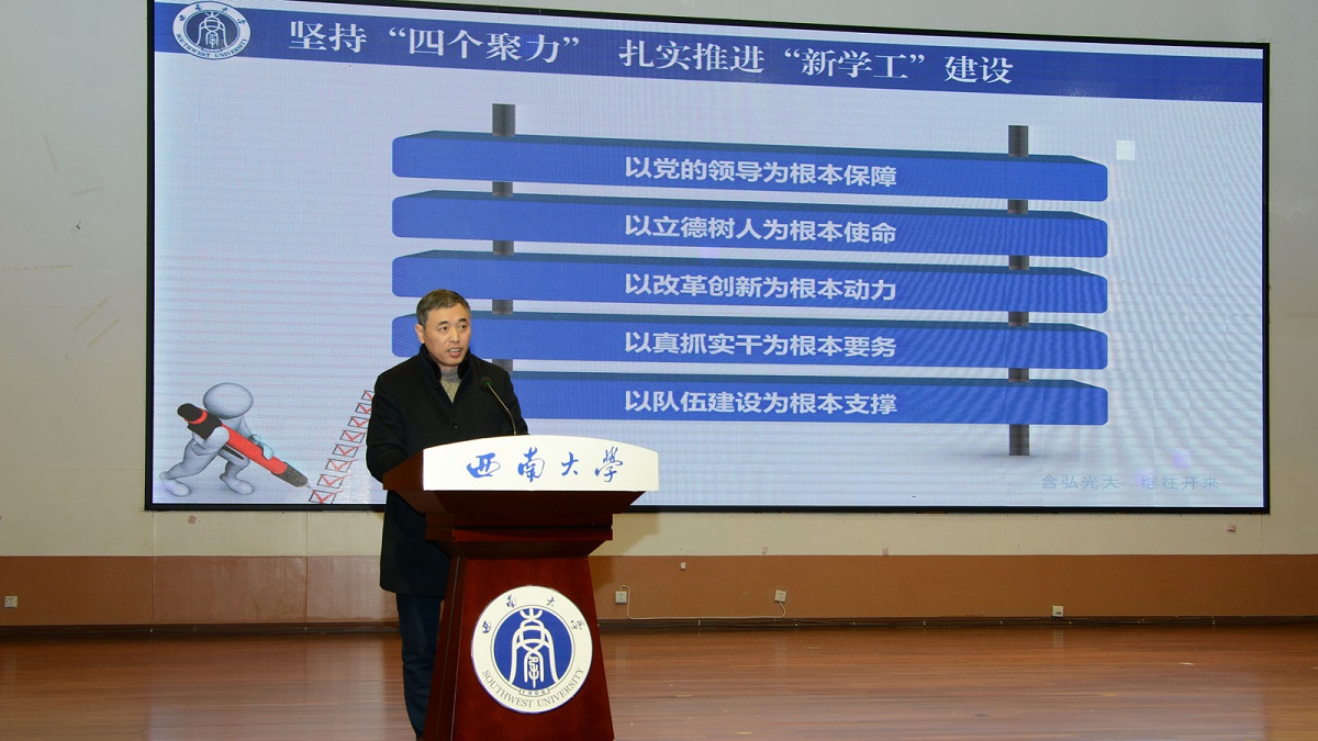 潘洵副书记以“坚持‘四个聚力’ 扎实推进‘新学工’建设”为题,作2019年学生工作报告。围绕本科生学生工作、研究生教育管理服务、招生就业工作、共青团工作、安全保卫工作、创新创业教育、国防生培养等七个方面,潘洵副书记对2019年学生工作做了全面系统总结,对存在的薄弱环节进行了深刻剖析,对2020年工作做了重点部署。