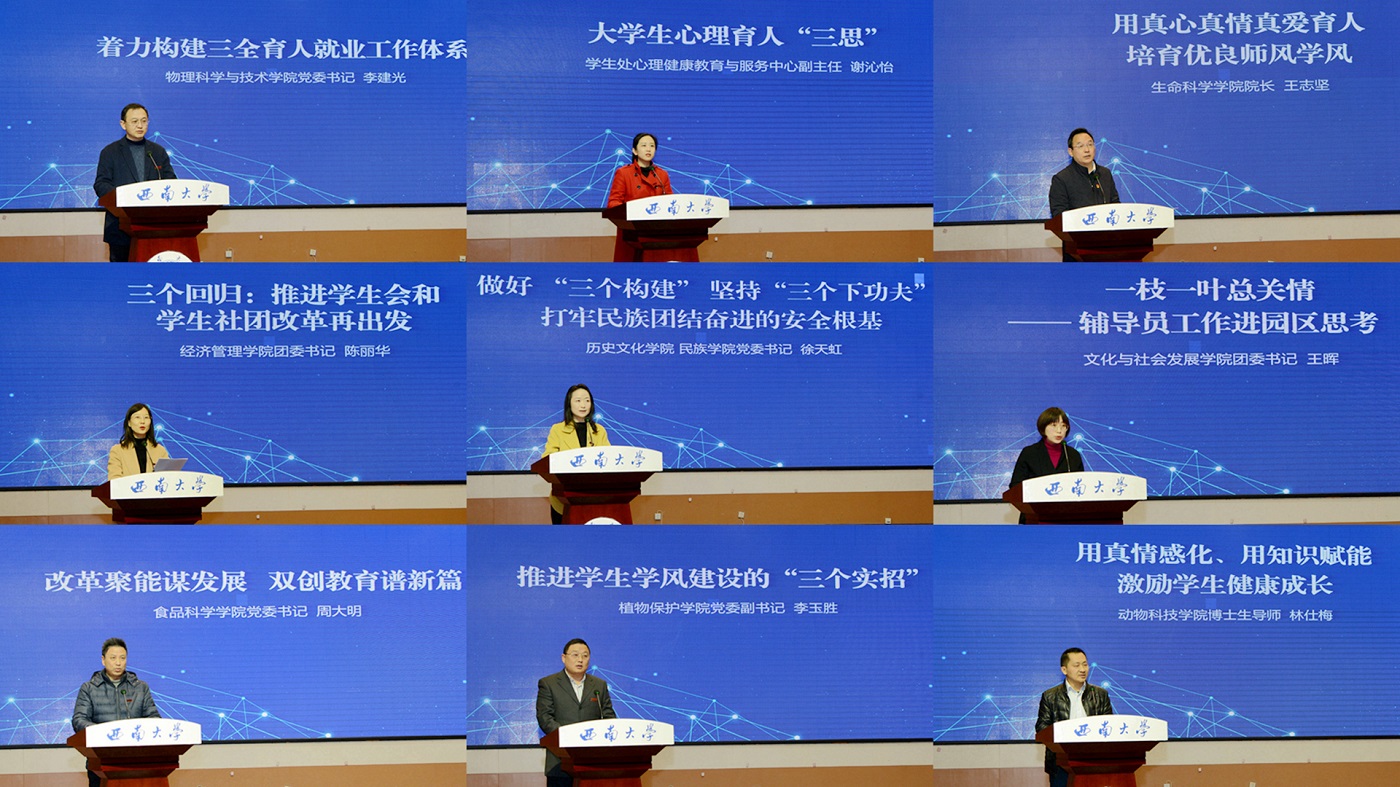 物理科学与技术学院党委书记李建光、心理健康教育与服务中心副主任谢沁怡、生命科学学院院长王志坚、经济管理学院团委书记陈丽华、历史文化学院民族学院党委书记徐天虹、文化与社会发展学院辅导员王晖、食品科学学院党委书记周大明、植物保护学院党委副书记李玉胜、动物科技学院博士生导师林仕梅等九位代表围绕“三全育人就业工作体系”“‘贯通式’心理育人”“师风学风建设”“学生组织改革”“民族学生教育管理”“园区育人”“双创教育”“本科生导师育人”等内容,结合岗位和工作实际做交流发言,分享了工作体会与思考。