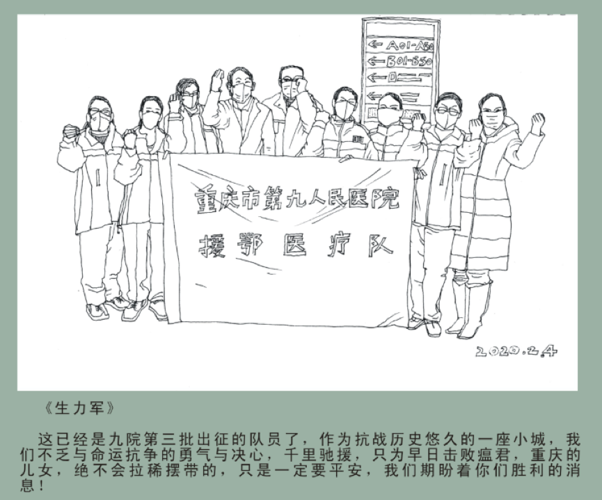 金年会jinnianhuicom美术学院副教授唐楚孝的一张画近日被重庆市第九人民医院收藏了。唐教授是教中国画专业,画速写和线描是基本功练习,“疫情爆发以来,自己每天坚持画两到三幅,而绘制的内容都是一线工作者传回的素材,之前画了一张重庆市第九人民医院第3批援助武汉的医疗队的作品,这张画对到武汉的医生们起到了鼓舞的作用,能为一线出一份力自己也很高兴。”