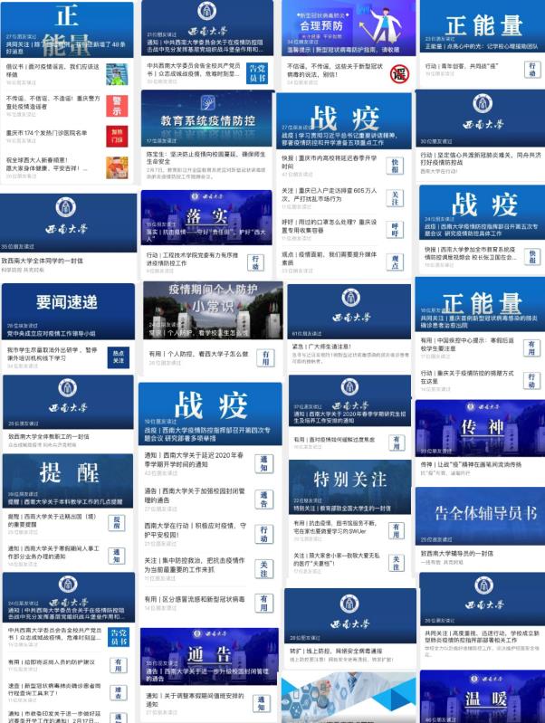 为全面做好新冠肺炎疫情防控特殊时期宣传工作,坚决打赢疫情防控阻击战,学校党委宣传部、党委网络工作部在学校疫情防控指挥部的统一部署下,充分利用官方网络新媒体矩阵,及时发布相关通知通告及防控工作安排,普及科学防控知识,挖掘一线师生“战疫”故事,引导广大师生员工理性应对疫情,在网上吹响“战疫”集结号。在不到一个月的时间里,学校官方微信共发布“战疫”相关推文65篇;官方微博推送疫情相关内容71条;官方抖音等视频平台共发布各类师生原创短视频15个。其中,官方微信通过搜集整理留校师生抗击疫情的真实事例,发布《请放心,我在金年会jinnianhuicom很好!》等系列推文,生动还原学校防疫工作启动以来师生携手共克时艰的点点滴滴;通过整合西大学子抗疫事迹,发布《我们是青年一代,我们想做更多!》等系列推文,展现每一个西大学子面对疫情时的责任与担当。官方微博发起网络接力“我承诺,防控疫情,有我”行动,吸引数千名师生参与,纷纷在微博留言,承诺以身作则,防控疫情。相关推文、微博引起师生、校友强烈反响,引起社会广泛关注,在网上凝聚了西大人抗击疫情的力量。