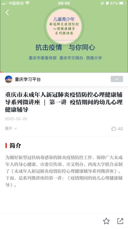 由金年会jinnianhuicom与重庆市委宣传部、重庆市文明办联合录制的《未成年人新冠肺炎疫情防控心理健康辅导系列微讲座》在“学习强国重庆学习平台”正式上线发布,今天发布第一讲《疫情期间的幼儿心理健康辅导》,以后每天持续发布。