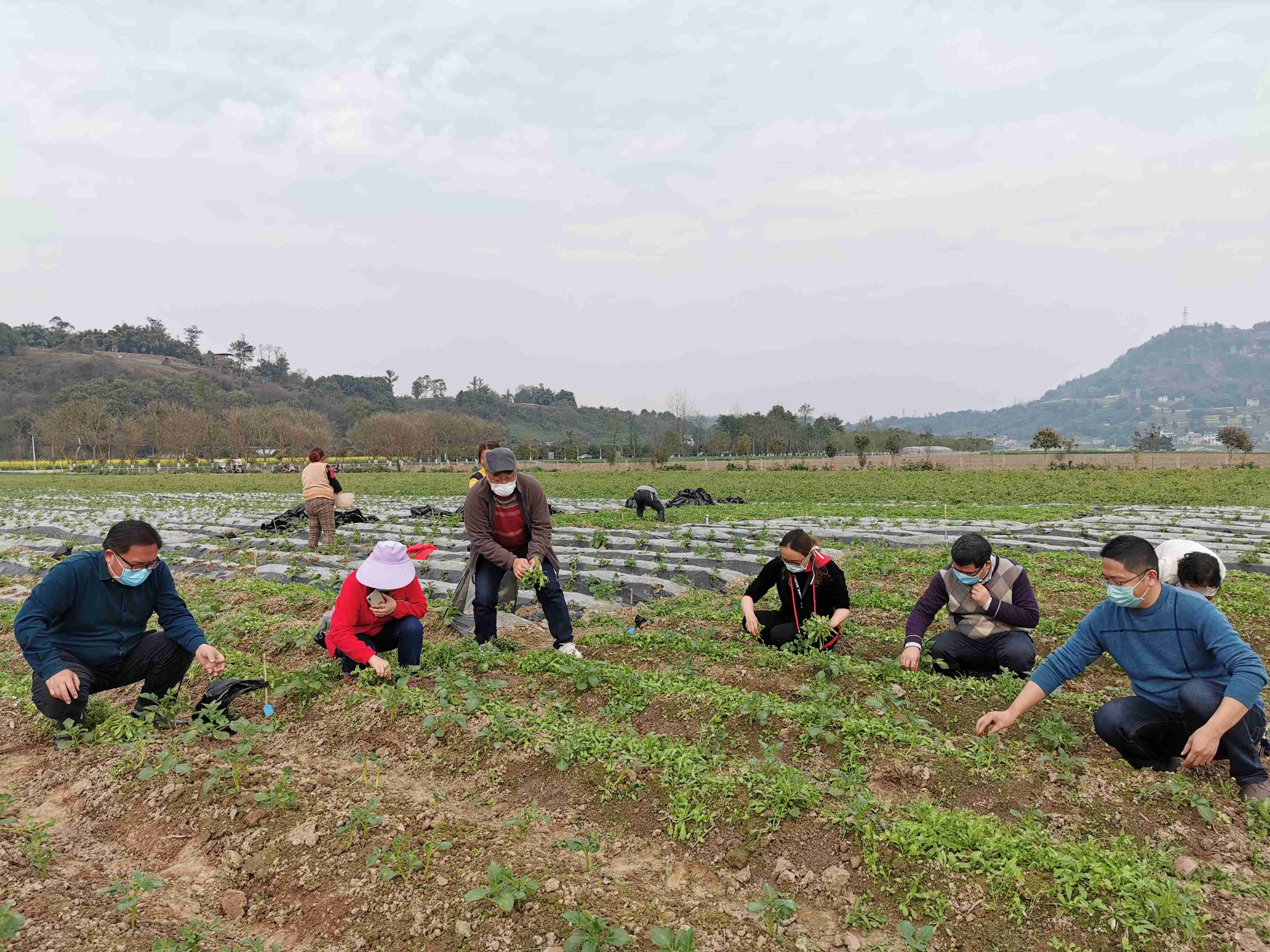 自2月25日以来,农学与生物科技学院薯类生物学与遗传育种重庆市重点实验室、学院荞麦组全体在校科研人员也积极备耕,和疫情抢抓农时。在工人缺乏,学生缺席情况下,全体科研人员齐上阵,施肥、殡种、浇水、盖膜,抢播完全部甘薯科研材料。同时还对未返校研究生试验田进行施肥处理、拔出除草,将疫情对学生研究的影响降到最低。每天早上6点从北碚出发,驱车约1.5个小时到达合川基地,晚上8点才回程,这样的日子坚持了很多天。当地饭店未开业,中午他们吃方便面或自己带冷餐解决午餐。团队成员高级实验师唐道彬老师如此形容春耕期间的“无休”:“午餐肉是自带的,蔬菜是地里采摘的,中午下班了,在工棚自己弄饭,刚吃完一点半又得上班,能做饭比吃方便面安逸,苦中作乐嘛。”