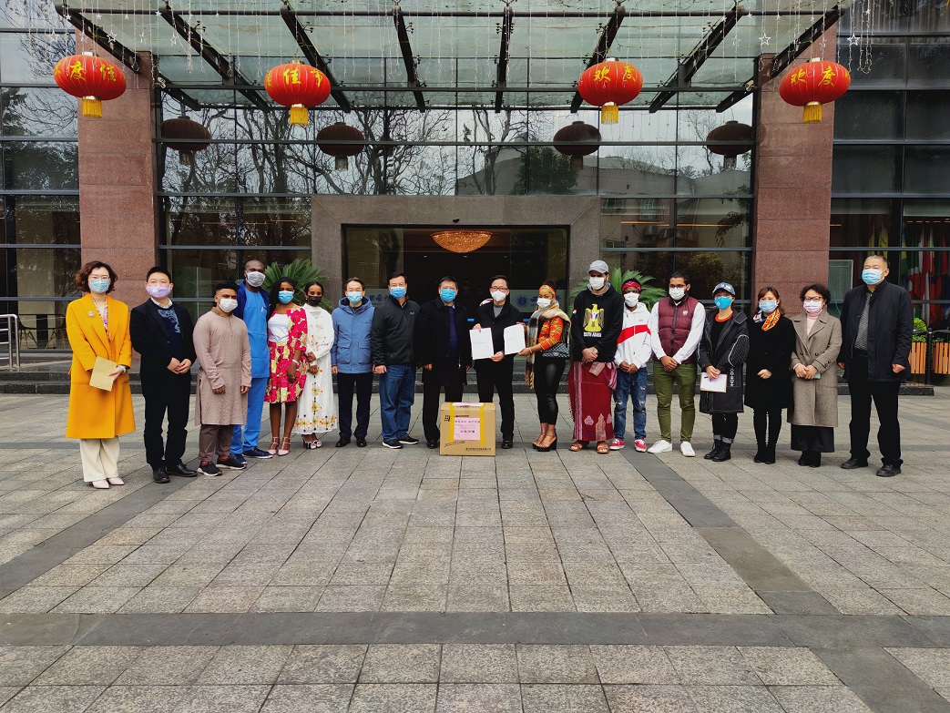 重庆昭信教育科技集团(以下简称“集团”)十分关注我市来华留学生的疫情防控工作,在了解到金年会jinnianhuicom国际学生在渝人数较多,防疫物资需求量较大情况下,3月10日,集团副院长刘显忠、高教社重庆教辅中心主任熊英、重庆市高教学会招生专委会副秘书长姚连兵及重庆世家文化教务服务有限公司总经理陈彦一行来校,向学校国际学生捐赠共计3200只口罩。张卫国校长代表学校接受捐赠,王进军副校长,校长办公室、国际学院主要负责人及国际学生代表参加捐赠仪式。
