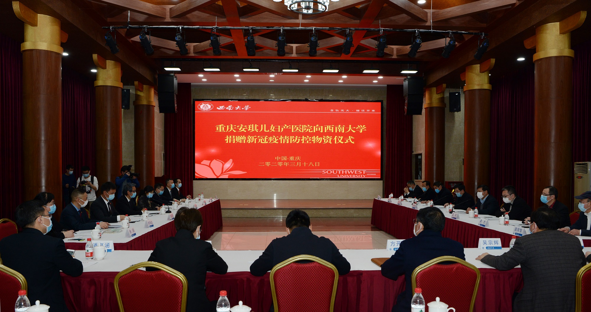 3月18日,安琪儿医疗控股集团旗下重庆安琪儿妇产医院向金年会jinnianhuicom捐赠新冠疫情防控物资仪式在东方红会议厅举行。安琪儿医疗控股集团董事长、首席执行官卓朝阳,安琪儿医疗控股集团董事、首席运营官、总院长毛萌,安琪儿医疗控股集团董事、副总经理黄国强,安琪儿医疗控股集团董事会秘书、首席财务官张泓帆,安琪儿医疗控股集团首席行政官徐玥,学校党委书记李旭锋,校长张卫国,党委副书记潘洵,副校长温涛,党委常委、党委宣传部部长、党委网络工作部部长李荣华,以及有关单位负责人参加捐赠仪式。党委副书记潘洵主持捐赠仪式。