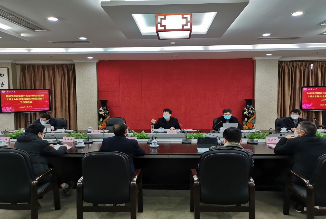 3月17日,依托全国重点马克思主义学院平台,由中宣部理论局委托学校党委负责的2020年度中央“马克思主义理论研究和建设工程”重大项目、国家社科基金特别委托项目《健全人民文化权益保障制度研究》工作推进会在校召开,党委书记李旭锋,各子课题组成员及党办、社科处负责同志参加会议。会议由党委副书记潘洵主持。