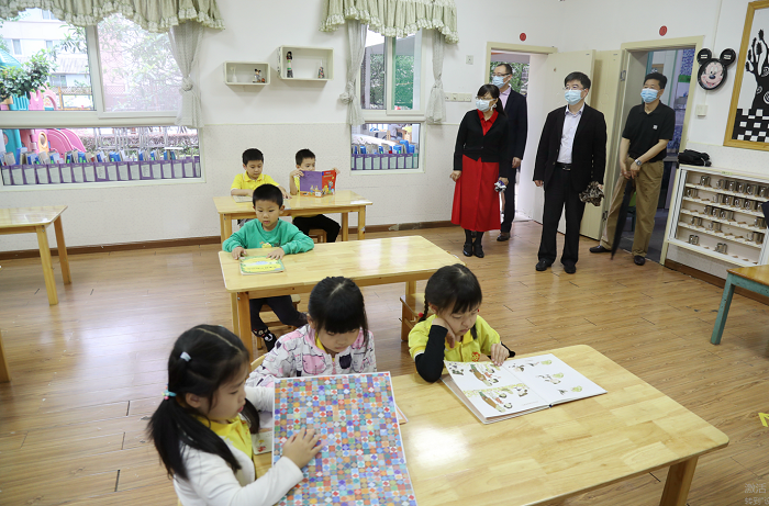 李旭锋一行在幼儿园大门处详细了解了安全闸门的使用情况和“三步晨检”的具体内容、开展形式。随后,李旭锋一行来到大班活动室观看孩子们活动开展情况,对幼儿活动间距、活动频次等要求表示赞同,就幼儿园用餐安排、卫生要求、防控物资准备、突发事件处置预案等内容进行了详细问询了解,对防控工作常态化背景下幼儿园工作的开展给予了进一步指导、关心。在幼儿食堂巡查中,李旭锋一行对幼儿餐点从采购到上桌各个环节和流程进行了具体了解,并查看幼儿食谱,对幼儿用餐营养搭配表示肯定。
