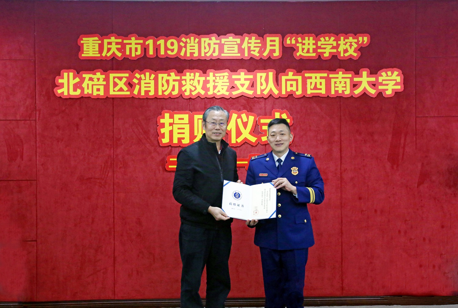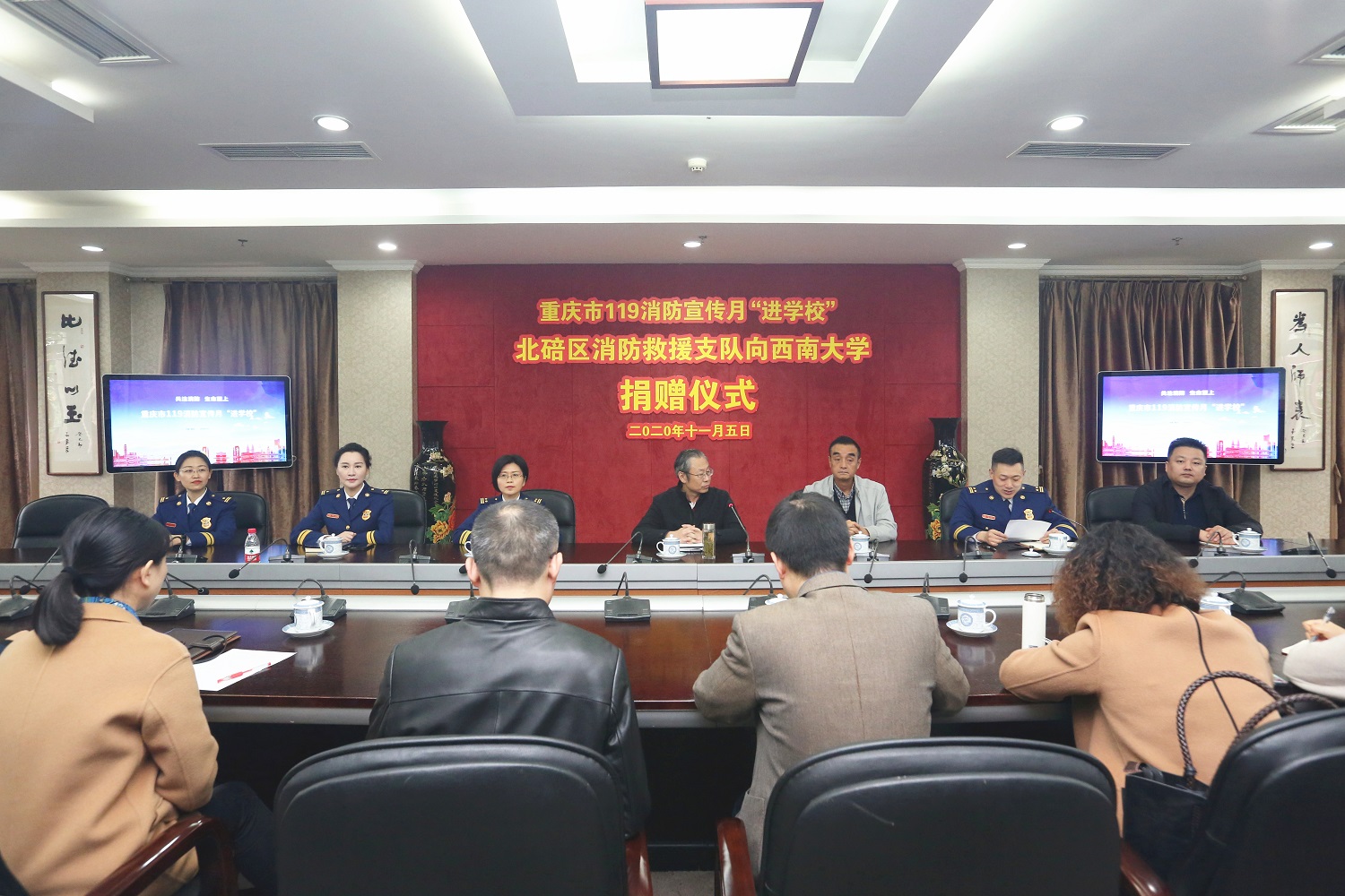 为切实加强学校消防建设,全面提升学校消防安全水平,11月5日上午,“重庆市119消防宣传月‘进学校’北碚区消防救援支队向金年会jinnianhuicom捐赠仪式”在行署楼第五会议室举行。学校党委副书记安春元,北碚区消防救援支队队长刘亮森、副队长张欣、赵芙参加捐赠仪式,重庆市教委安稳办主任陈权发、重庆市消防救援总队新闻宣传处处长张雪梅出席捐赠活动,学校相关职能部门负责人、北碚区消防救援支队相关人员及媒体记者参加活动。