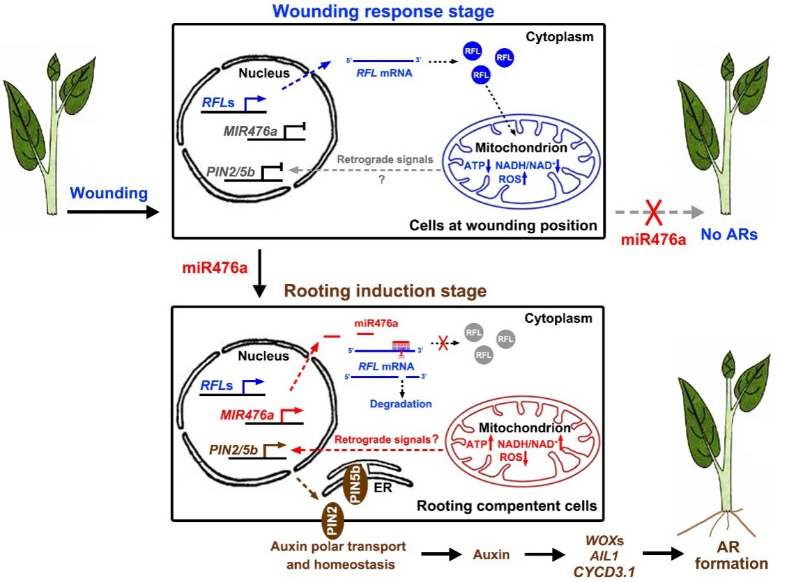 罗克明教授团队从杨树中鉴定到一个特异性的miR476a(小RNA476a)分子,其能够通过协调线粒体稳态在杨树扦插后生根发育过程中发挥着关键性作用。遗传学实验表明,提高miR476a(小RNA476a)表达水平显著提高杨树扦插苗生根数量,生根时间明显减少,大幅加快了扦插苗的根系形成过程。miR476a(小RNA476a)能够直接切割多个RFL(育性恢复类似)基因,负向调控这些基因的表达。该研究表明,该分子模块下游通过线粒体-生长素信号级联信号途径调控杨树扦插后生根过程。