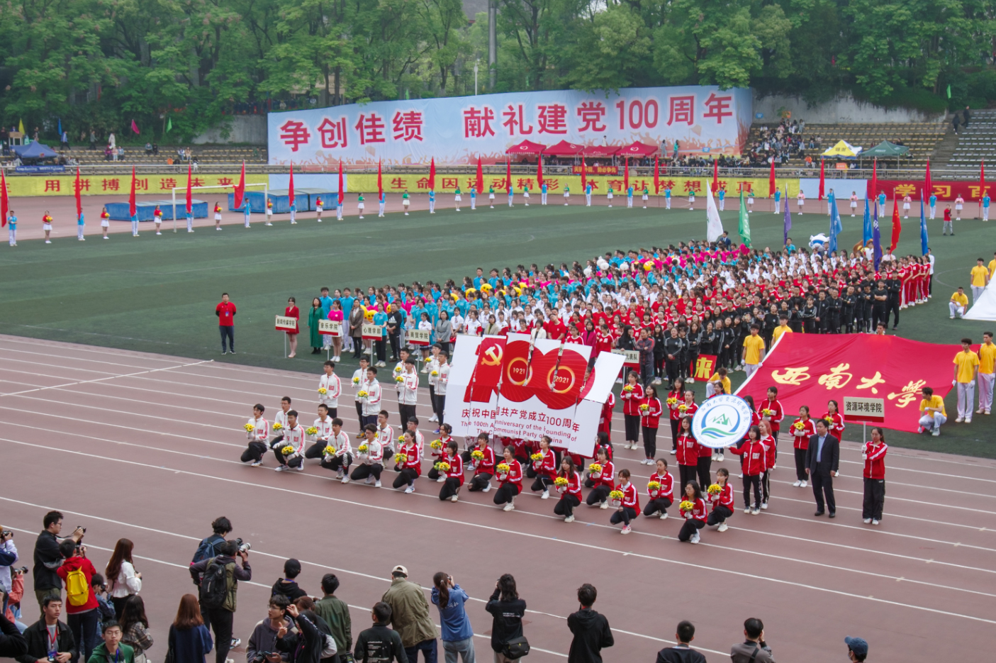 资源环境学院方阵举起拼图板拼出中国共产党成立100周年庆祝活动标识;文学院于方阵主席台前放飞上百个多彩的心形气球;地理科学学院方阵展出中国的海陆领域地图;食品科学学院方阵持着灯笼,抬着“火锅”上场,尽显重庆“风味”。各学院(部)用自己的特色方式展现专业特色、献礼建党百年。方阵表演结束后,现场升国旗奏国歌。