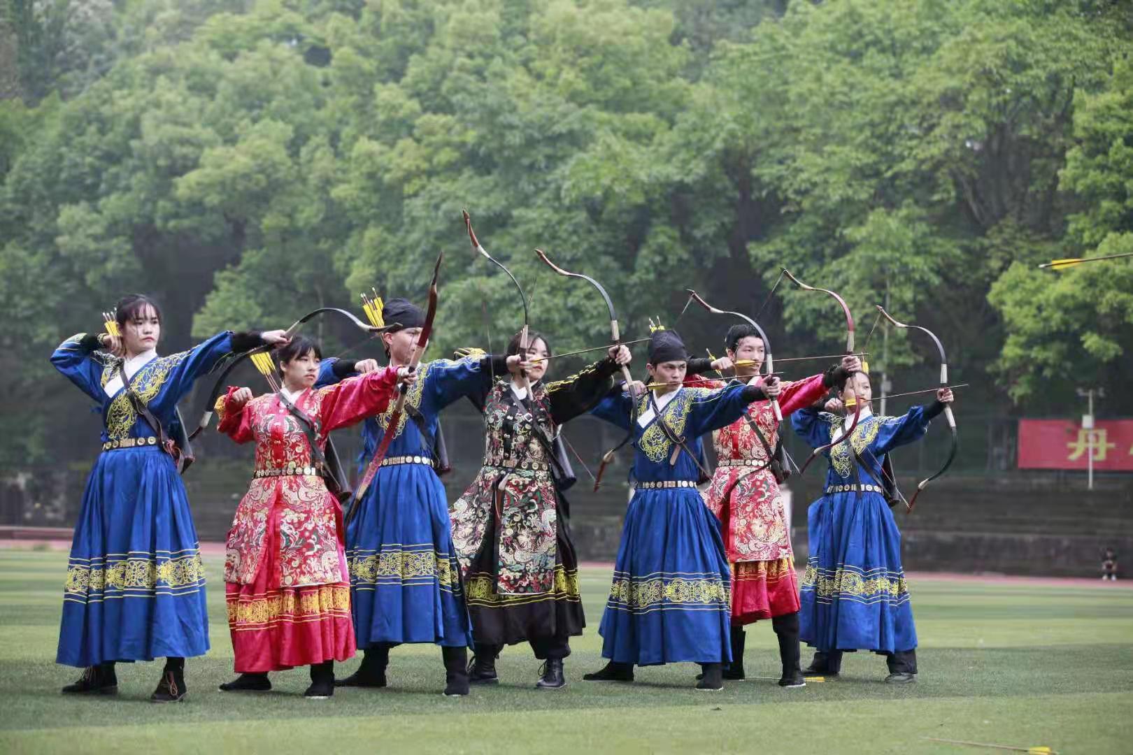 中华射艺、柔力球、花样跳绳、健美操等多彩活动依次登场,阴雨天的操场沸腾起来。在热烈的掌声中,七名身着不同颜色传统射艺服饰的弓手飒爽进场,举弓、引弓、撒放等一系列动作一气呵成,正中靶心。另有一名骑射射手,以独轮车代替传统骑马射箭,于眨眼间抬手放箭,精准命中。