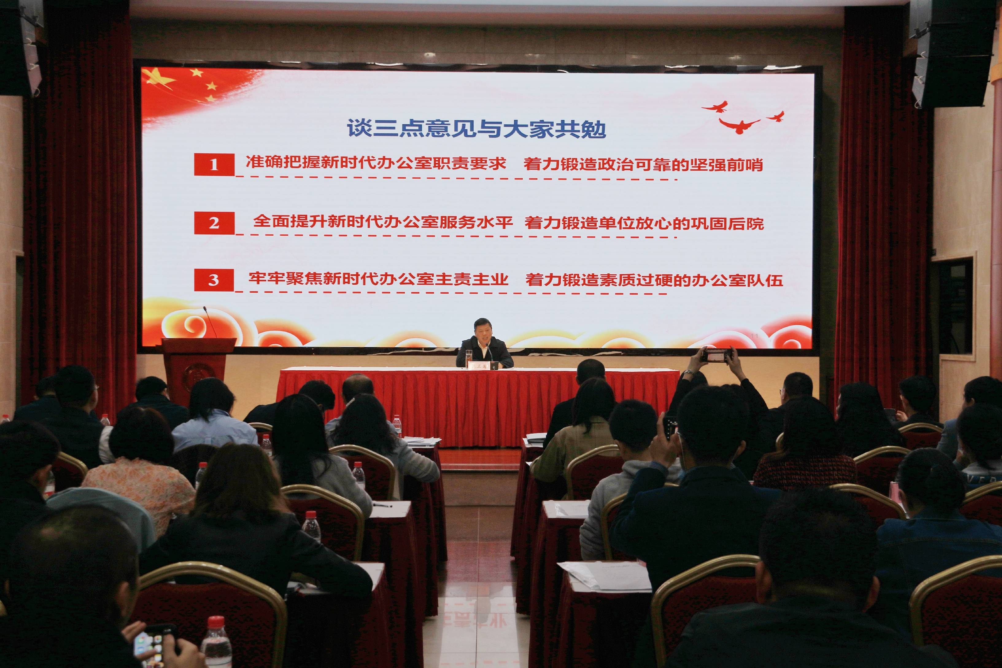 张卫国指出,办公室是一个单位的枢纽和窗口,担负着综合协调、参谋助手、督促检查和服务保障等职能。做好新时代办公室工作,一是要准确把握职责要求,始终做到绝对忠诚、学习研究、吃苦耐劳、廉洁自律,着力锻造政治可靠的坚强前哨;二是要全面提升服务水平,服务大局抓谋划,把握重点抓落实,统筹协调抓运转,着力锻造单位放心的巩固后院;三是要牢牢聚焦主责主业,严格落实“五个坚持”,着力锻造心中要有光、心中要有位、心中要有责、心中要有爱、心中要有畏的素质过硬的干部队伍。