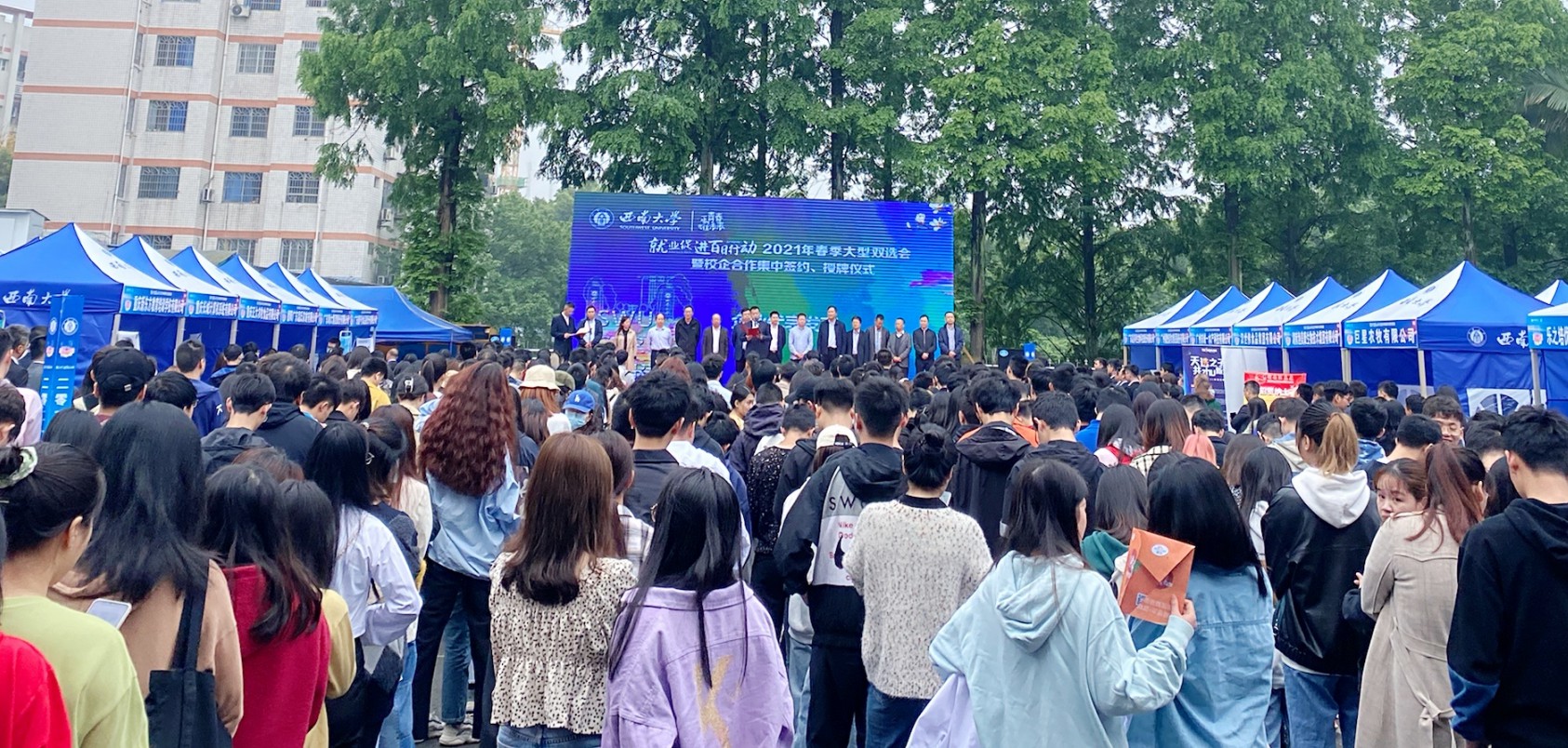 为深入贯彻党中央、国务院“六稳”“六保”工作要求和关于做好高校毕业生就业工作的决策部署,落实教育部和重庆市教委2021届高校毕业生“就业促进百日行动”,大力推进毕业生更充分、更高质量就业,搭建学校毕业生与用人单位双向选择平台,继4月2日在北碚校区举办“2021届毕业生‘就业促进百日行动’大型双选会”之后,5月7日,学校在荣昌校区新学生活动中心广场再次成功举办“就业促进百日行动”2021年春季大型双选会(荣昌校区专场)暨校企合作签约、授牌仪式。