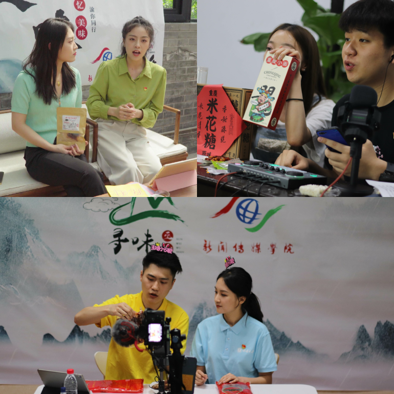 5月8日下午,在支部师生党员带领下,播主学子们兵分四路,围绕“美味在山城 助农在行动”“碚城印象”“云蜀环游记”“寻味巫山”主题,分别在微信、抖音、淘宝等直播平台进行直播带货,宣传售卖川渝特色“土货”产品,如重庆小面、江津米花糖、北泉空心面、巫山五花腊肉、彝族手工银饰等。在近两个小时的直播中,同学们不仅卖力用心介绍产品,还通过现场演绎原创说唱歌曲、播放专题拍摄视频、互动抽奖等创新环节增加直播间人气,收获数万网友关注。据了解,此次活动筹备历时一个半月,师生党员和同学们从活动策划、外联选品、平台对接到宣传推广、场控技术、直播演练,全情投入,确保直播活动的顺利举行。