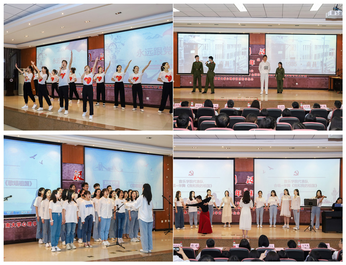 药学院本科生药学党支部在活动中献上经典合唱《歌唱祖国》,音乐学院本科生2018级党支部最后送上歌曲伴舞《我和我的祖国》,表达对祖国和人民的无限热爱,对党带领人民走向胜利、带领祖国走向繁荣富强的无限感激。