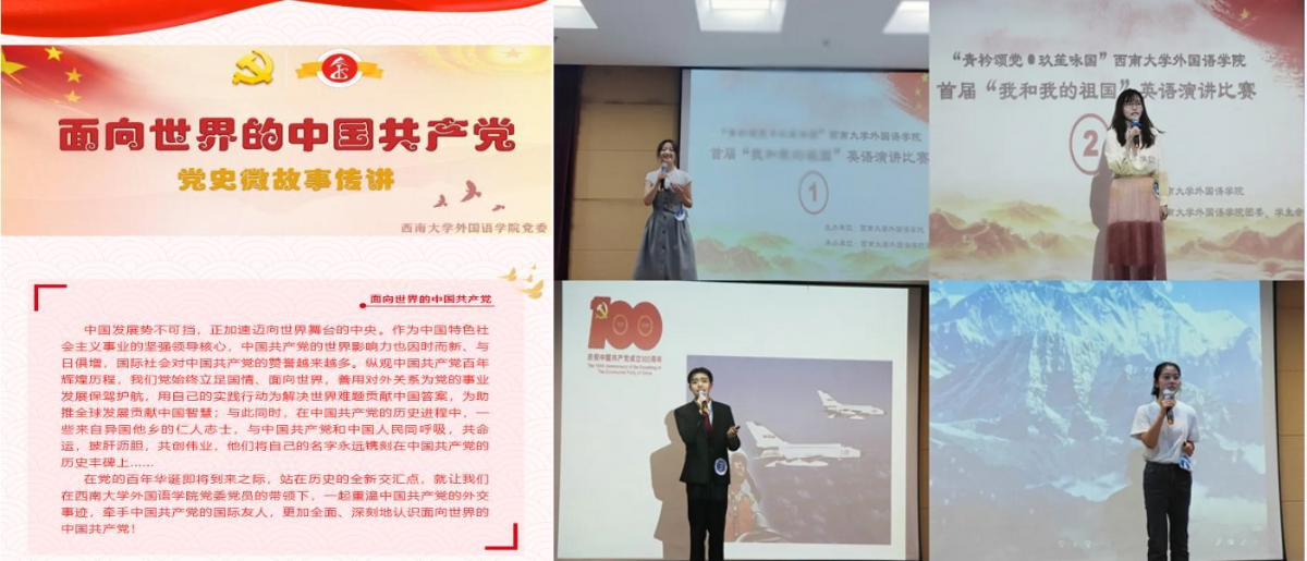创新视角,学好百年党史。开展“面向世界的中国共产党”党史微故事传讲活动,组织党员从专业角度出发深入挖掘党的百年光辉历程中的重大外交事件和国际友人事迹,以全球视野讲述党的历史故事,引导广大师生更加全面、深刻地认识面向世界的中国共产党。用好重庆红色教育资源,以中共中央南方局的对外交往故事为主题,制作精品微党课,“身临其境”展示党的外交风采,激励广大师生强化参与全球治理的意识与能力,以史为鉴,洞悉未来,助力开创中国特色大国外交新局面。