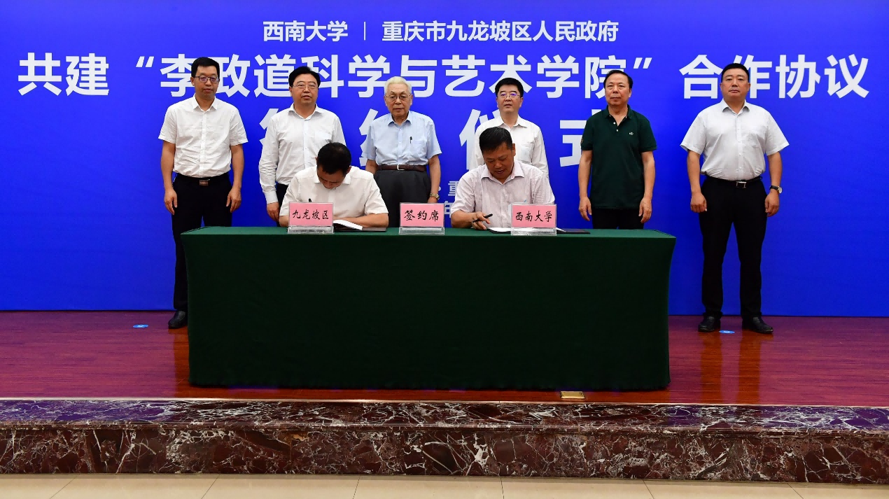 张卫国、刘小强代表双方签署“李政道科学与艺术学院”合作共建协议。根据协议,九龙坡区提供办学经费和办学条件,学校联合中国科学院大学在九龙坡建设李政道科学与艺术学院。该学院为公办性质,是学校的二级教学科研单位,探索高校为主体,政府、行业、企事业单位多方参与的办学模式,致力于培养具有强烈社会责任感、深厚科学与艺术人文底蕴、扎实专业知识、富有创新精神和实践能力的高素质科学艺术复合型人才。