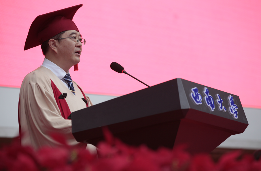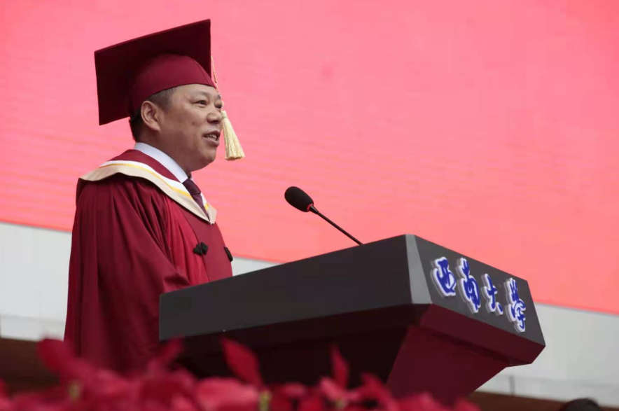 校长张卫国以“在历史大潮中追光前行”为题,为毕业生上了在西大的“最后一课”。他向顺利完成学业的同学们送上诚挚祝福,向传道授业、精心服务的教职员工致以崇高敬意,向始终关注同学们成长成才的亲朋好友和各界人士表达衷心感谢。张卫国饱含深情地带领大家回顾了大学四年的点滴经历,他勉励同学们不要习惯于“佛系”,沉溺于“躺平”,西大学子即使要做也做“斗战胜佛系”,短暂的“躺平”也是为了更加奋发激扬!他鼓励同学们要主动融入国家发展,顺势而为,乘势而上,在历史大潮中追光前行,奋力开启人生新的征程。张卫国向同学们提出三点希望:一是用理想引领青春之路;二是用奋斗点燃青春之火;三是用担当谱写青春之歌。