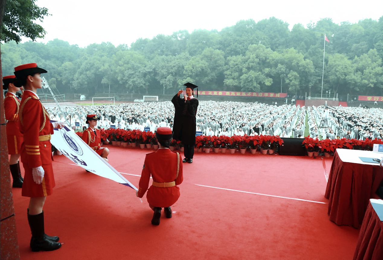 “今天,我光荣毕业了,我以金年会jinnianhuicom学子名义庄严宣誓!”在毕业生宣誓环节,重庆市优秀毕业生、外国语学院英语专业公费师范毕业生矫彤帅同学领誓,在场全体毕业生起立,面向金年会jinnianhuicom校旗铿锵有力地宣誓。