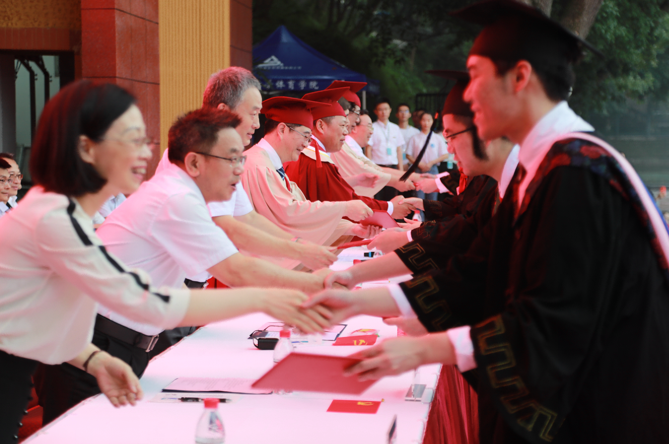在激昂奋进的音乐声中,主席台领导为获表彰的毕业生代表颁发荣誉证书,为毕业生代表颁发毕业证书。校学位评定委员会委员为学位获得者代表授位。