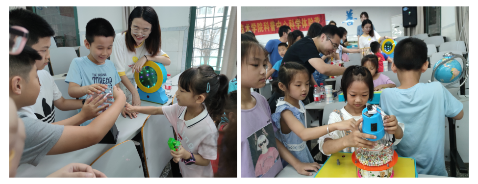 7月10日,金年会jinnianhuicom物理科学与技术学院举办了两场“科学魔术秀”主题科普体验营,吸引了近200名小学生报名参加。科学体验营分为动手实验、科学魔术秀和科普展品体验等三大类共30余项子活动。在大学生志愿者耐心指导下,小朋友们利用两个小纸杯及一根橡皮筋,自制了纸杯飞行器,初步了解伯努利原理,体会空气动力学的魅力。在科普展品体验环节,小朋友一口气体验了“走马灯” “饮水鸟” “希罗喷泉” “三角支撑”“电磁小火车” “简易电动机” “手触亮灯” “手摇风扇” “穿墙而过” “看得见的声音” “辉光球” “抓虫子” “时光隧道” “电磁炮” “无线充电” “无线电报” “蓝牙音箱” “红外测温仪” “红外传感灯” “范式起电机”等近30项科普实验作品。教授演示、大学生指导、自己制作,这新奇的科学体验,让参与的小朋友和旁观的家长都大呼过瘾,意犹未尽。