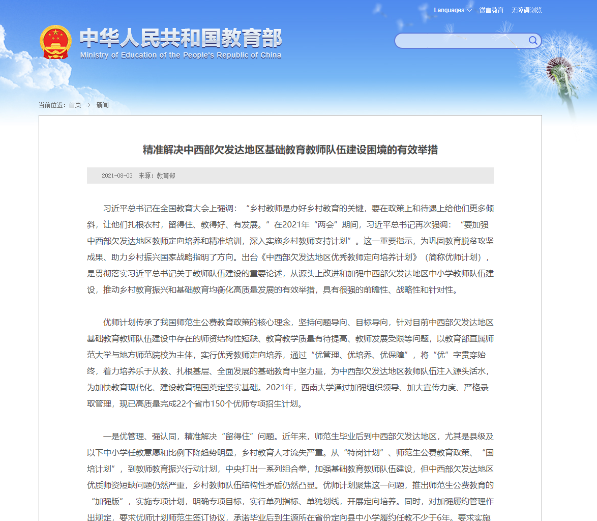 近日,教育部官网报道学校党委书记李旭锋,校长、党委副书记张卫国署名文章《精准解决中西部欠发达地区基础教育教师队伍建设困境的有效举措》。网站报道原文内容如下: