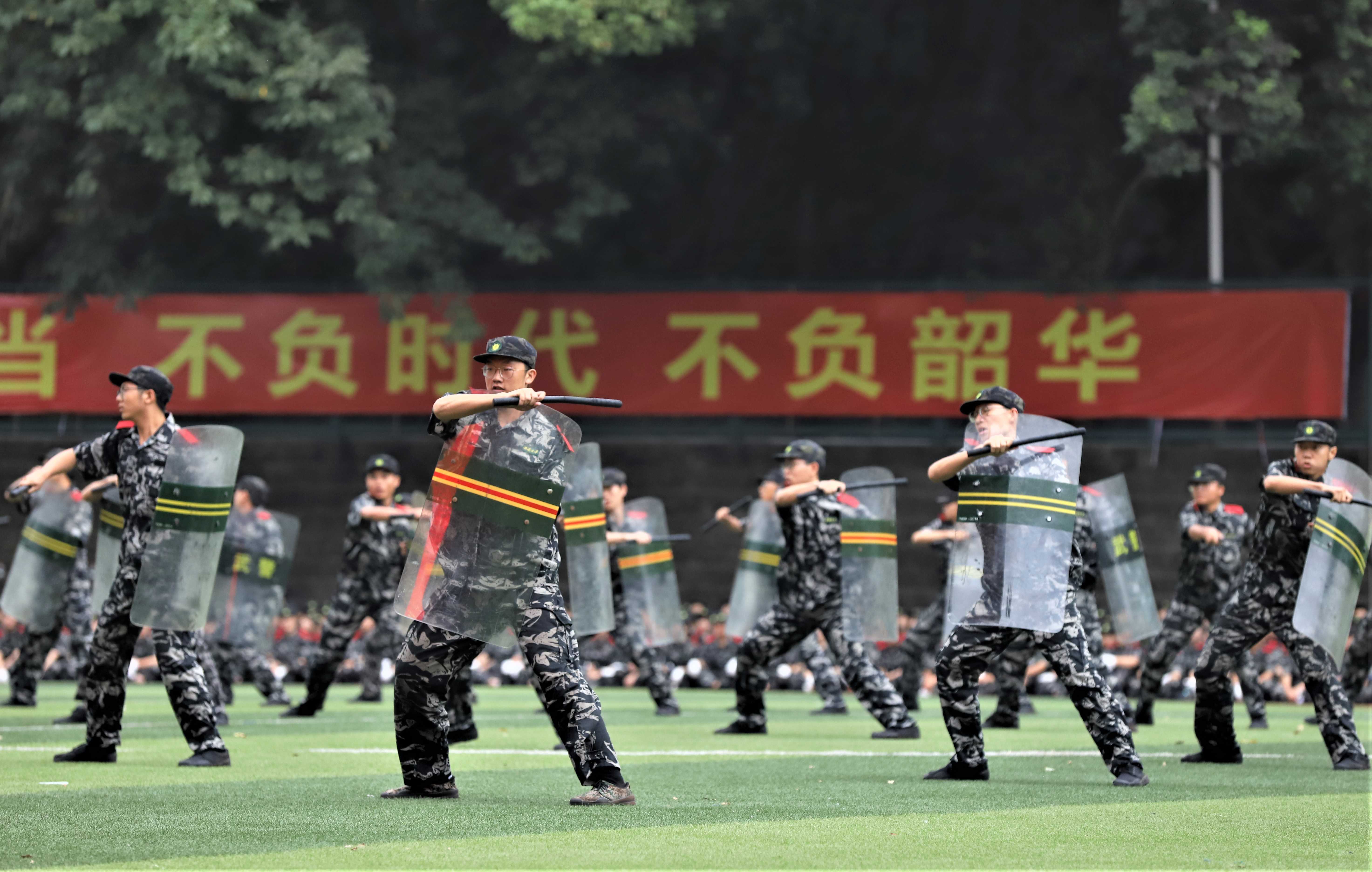 警棍盾牌操、应急棍术、刺杀术、匕首操、手枪操、心理健康操、擒敌拳、班进攻战术等科目表演轮番精彩上阵。应急棍术、刺杀术、擒敌拳招式孔武有力,尽显英姿勃发;匕首操、手枪操、心理健康操表演整齐划一,彰显青春力量;班战术攻防设计场景逼真、节奏激动人心,现场高潮迭起,掌声雷动。受训学员们以饱满的热情、昂扬的士气,充分展示出学校学子良好精神风貌,为本次军训交上了一份优异的答卷。