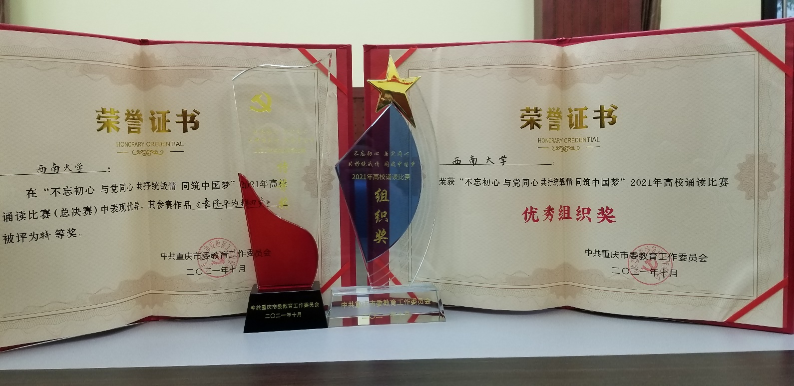 近日,“不忘初心 与党同心 共抒统战情 同筑中国梦”2021年重庆高校诵读总决赛在重庆理工大学举行。重庆市委统战部副部长李康,重庆市委教育工委委员、市委教育工委专职副书记覃正杰出席比赛并为获奖单位颁奖。由学校新闻传媒学院教师和学生组成的参赛队伍代表学校在比赛中以总分第一名的成绩荣获特等奖,同时,学校被授予优秀组织奖。