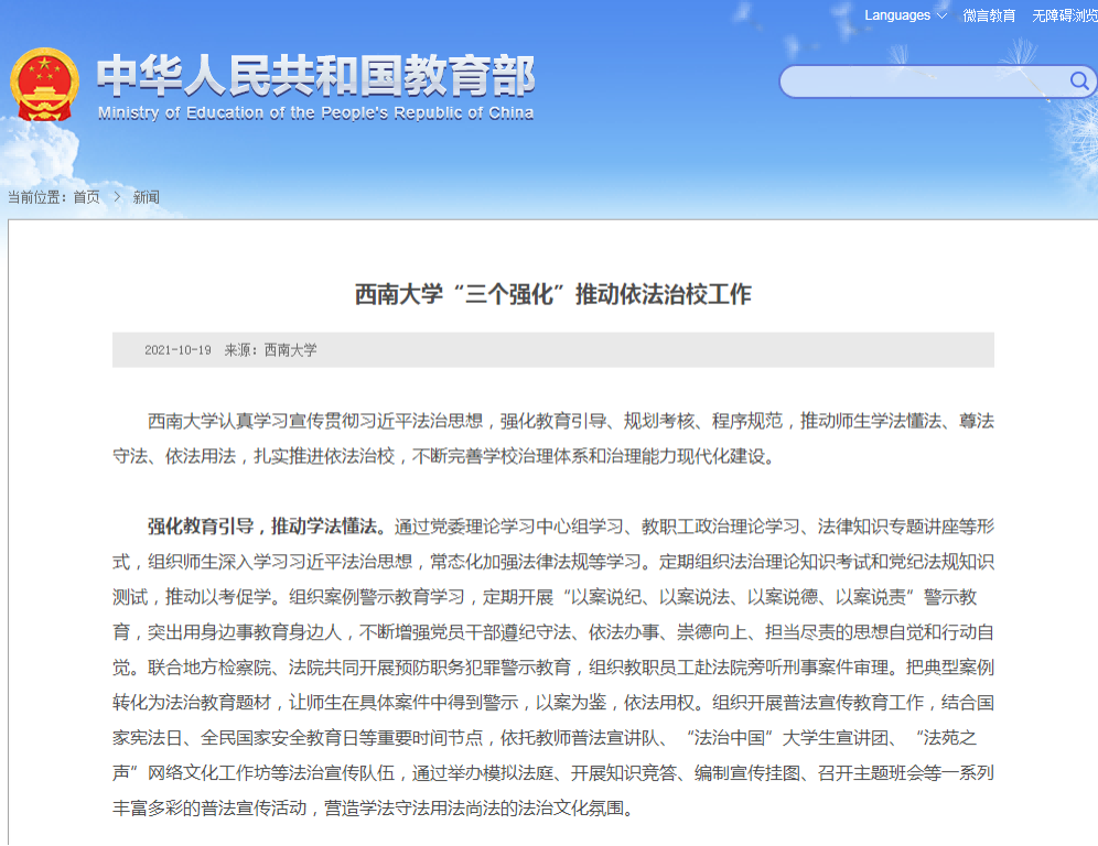 近日,学校“三个强化”推动依法治校工作受到教育部一线风采报道,相关内容由党政办公室报送。教育部网站报道原文如下: