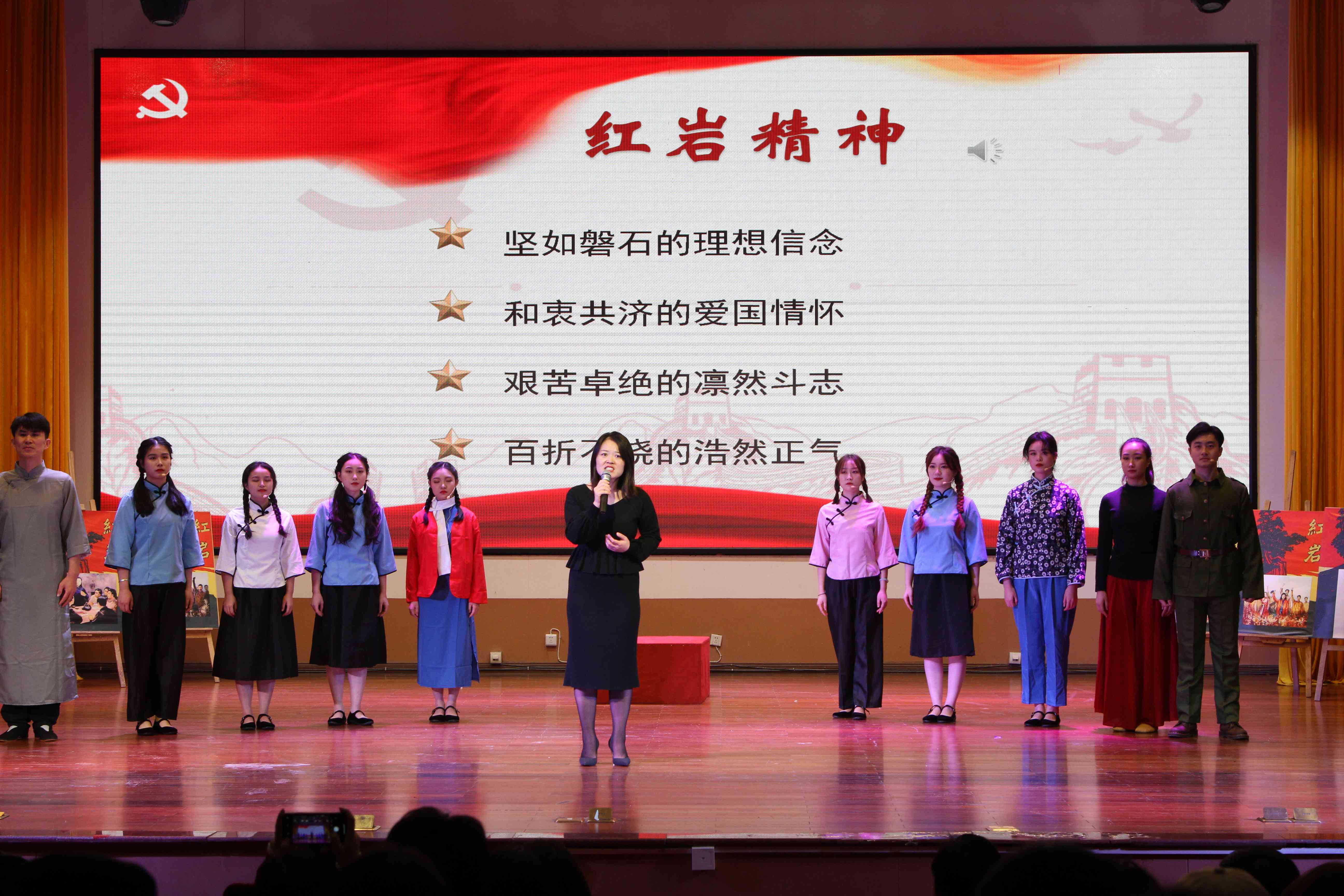 主讲人音乐学院葛爱新老师讲述红色经典歌曲《绣红旗》,音乐学院学子表演的情景歌剧还原了江姐带领狱友憧憬革命胜利,制作五星红旗的场景。优美动人的旋律中,现场师生身临其境的感受到了革命先烈对信念的无限忠诚。葛老师带领大家一起学习“红岩精神”的内涵和时代意义,并号召在场的新生们积极思考在新时代如何“绣”出“新天地”。葛老师还带领全体师生齐唱歌曲《不忘初心》,用歌声表达对英烈的慰藉和对未来的憧憬。