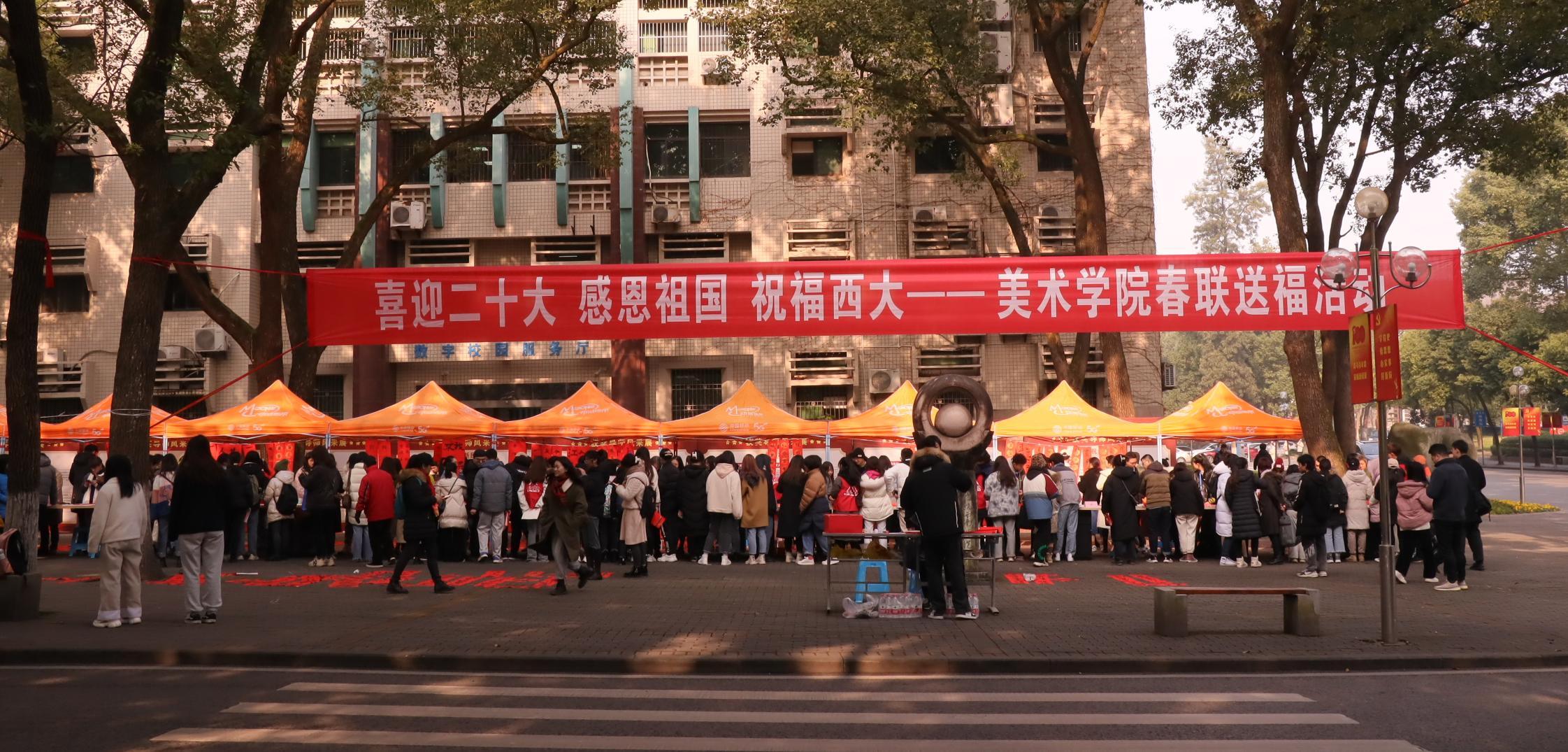 参加本次春联送福活动的主要是美术学院具有书法专长的教师和硕士、博士研究生。本次活动的特色在“订制式春联”和艺术“福”字。据悉,本次有不少的春联文案都是对国家的祝福,这也成为今年春节送福活动的一个亮点。不少师生是带着自己准备的草稿在现场排队领取,不少春联还带有一些网络新词,参与春联创作的师生们根据大家的需求书写,让内容更贴近师生生活。凝神提笔、挥毫泼墨,不仅以送祝福的方式丰富西大师生的校园文化生活,促进艺术创作的教育、普及和推广,更饱含学校艺术家们对党和国家美好未来的愿景、对学校师生美好生活的向往。