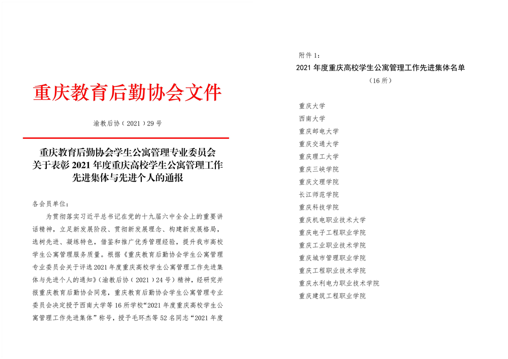 2021年12月31日,重庆教育后勤协会对学生公寓管理专业委员会2021年度先进集体和先进个人的评选情况进行通报。学校荣获“2021年度学生公寓管理工作先进集体”称号,荣昌校区后勤工作办公室陈果获得“2021年度重庆高校学生公寓管理工作先进个人”称号,北碚校区后勤集团学生宿舍服务中心代凤等4人获得“2021年度重庆高校学生公寓服务工作先进个人”称号。