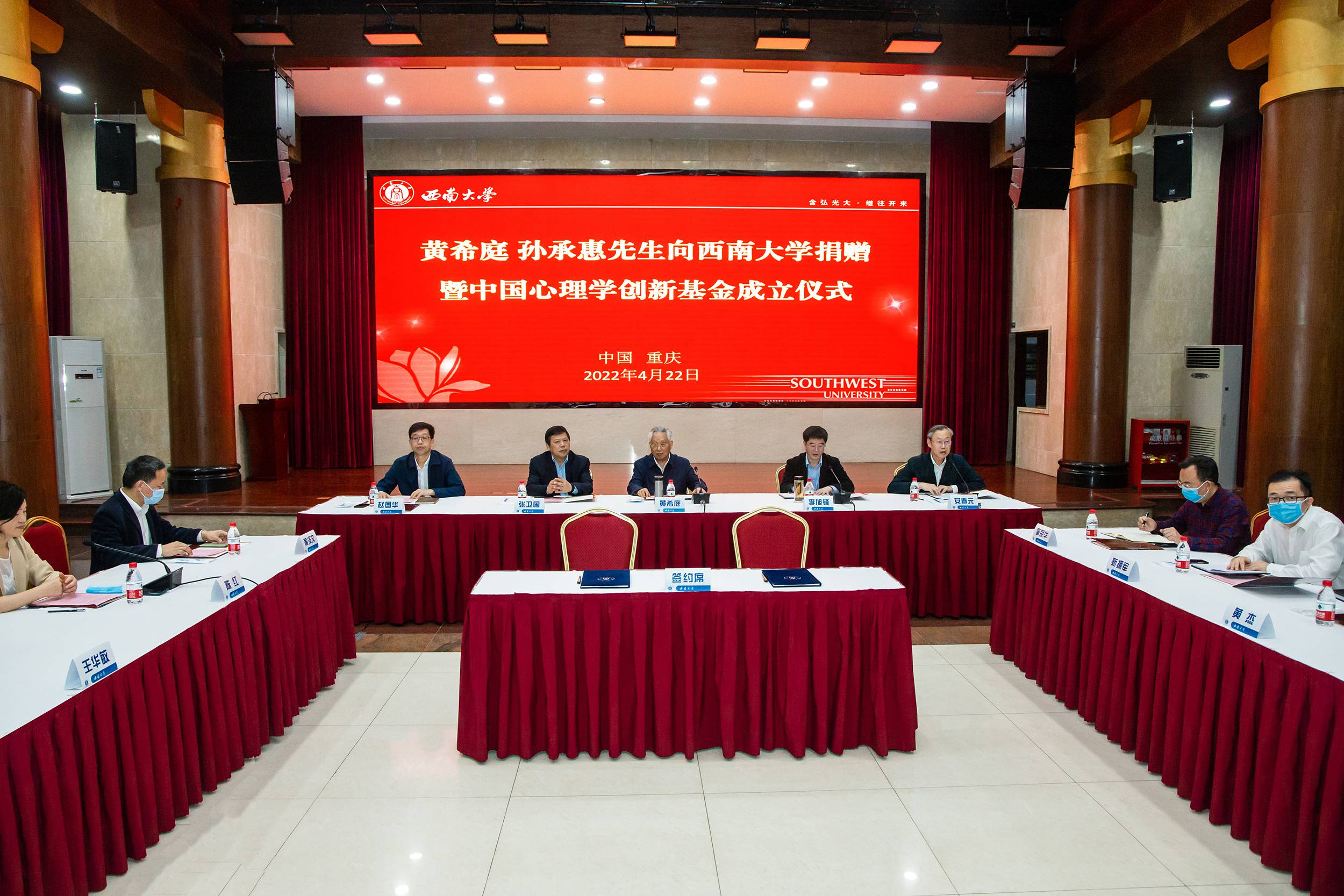 黄希庭教授是我国著名心理学家,从教60余年来,艰辛创业、坚毅有恒,为学校的心理学学科建设、为中国心理学事业的发展和人才培养作出重要贡献。为推动中国心理学创新发展,黄希庭慷慨解囊,将本人及其夫人孙承惠(已故)的一生积蓄300万元捐赠给学校,设立“中国心理学创新基金”,用于奖励在中国特色心理学理论创新、研究创新、应用创新、教学创新等方面做出突出贡献的心理学工作者。