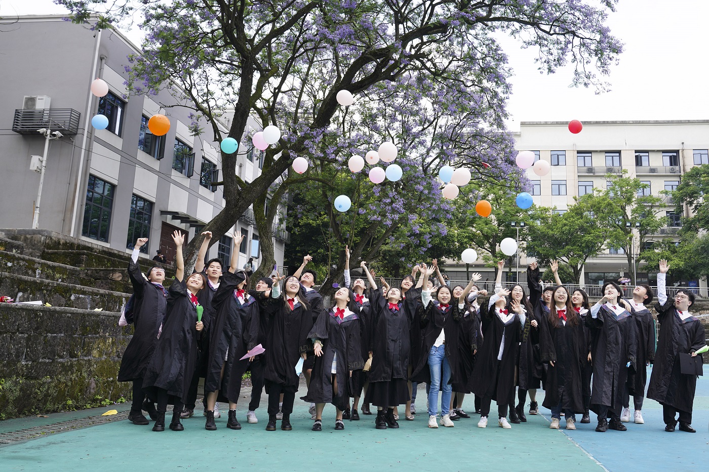 蓝花楹的花朵呈紫蓝色,雅丽清秀,气质浪漫,恰好符合毕业生那种对青春的感伤和对未来的憧憬,因此,它也被金年会jinnianhuicom师生称为“毕业花”。第四运动场旁,三株树龄五十多年的蓝花楹树下已经成为毕业生们拍摄毕业照的首选网红打卡地。