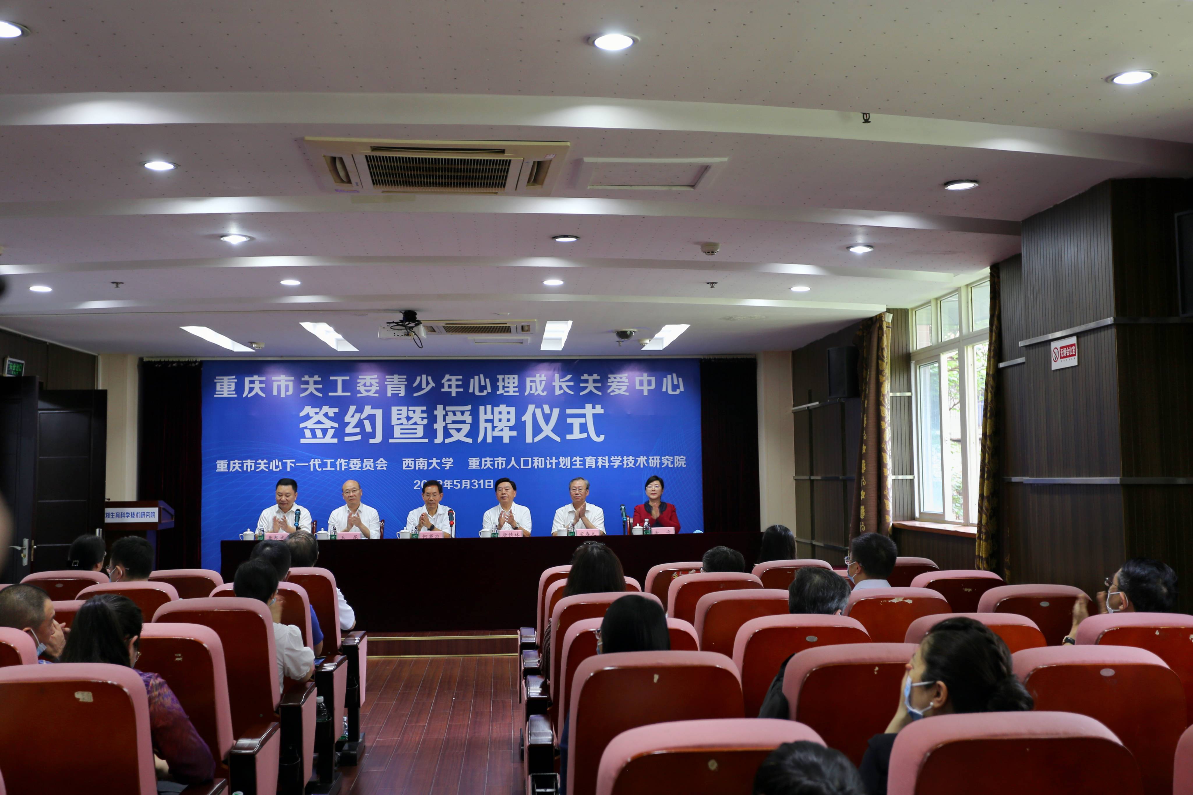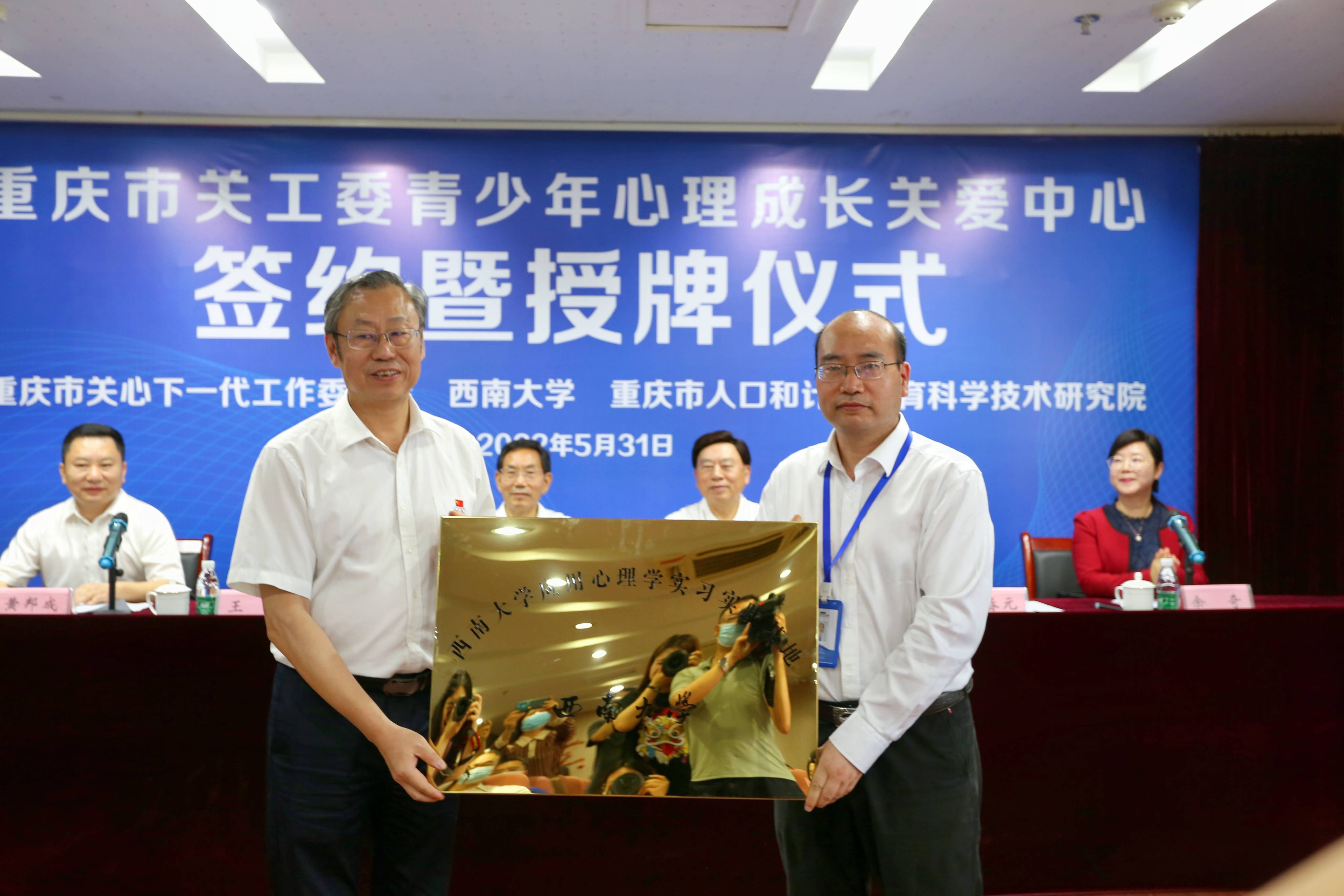5月31日,在“六一”国际儿童节来临之际,心理学部与重庆市关工委、重庆市人口计生研究院举行“重庆市关工委青少年心理成长关爱中心” “金年会jinnianhuicom应用心理学专业实习实践基地”签约暨授牌仪式。市关工委主任何事忠、常务副主任唐情林、副主任刘丽俐、秘书长韩国涛,市卫生健康委副主任王昆,市人口计生研究院党委书记黄邦成、院长余奇,学校党委副书记安春元出席仪式,学校国内合作处、心理学部有关领导教师参加仪式。