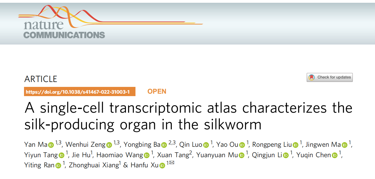 2022年6月9日,徐汉福教授课题组在国际知名期刊Nature Communications上发表了题为“A single-cell transcriptomic atlas characterizes the silk-producing organ in the silkworm”的研究论文,以单细胞分辨率揭示家蚕丝腺的全细胞异质性及其基因转录图谱。这是实验室团队继2003年解码家蚕全基因组DNA遗传密码后,从单细胞维度首次对家蚕产丝器官及其基因表达动态进行的超高分辨率解析,实现了家蚕丝腺研究从组织水平到单细胞水平的跨越。