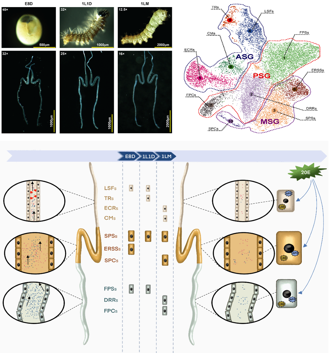 该项研究历时两年,课题组先后攻克了家蚕完整丝腺样本的大批量剖取和腺细胞解离等技术难关,累计解剖胚胎、蚁蚕和一龄眠期的家蚕个体近2万头。研究发现,家蚕丝腺中有10种主要细胞类群(cluster),它们分别执行丝素蛋白合成、丝胶蛋白合成、液态丝纤维化、细胞重建、丝蛋白代谢、几丁质代谢等功能。有趣的是,丝蛋白基因不但在龄期丝腺细胞高表达,在眠期亦有不同程度的表达;眠期丝腺细胞中基因表达非常活跃,一些信号转导通路如蜕皮激素(20E)信号、Hippo信号等参与其中,发挥着调控丝腺发育和丝蛋白合成的重要作用。研究人员还深入分析了各细胞类型随时间发育的拟时序变化,通过RNA velocity探究了在丝腺发育过程中不同细胞类型间的相互转换关系等。