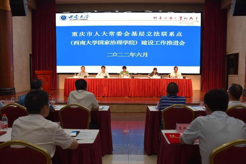 为深入学习贯彻习近平法治思想,坚持和发展全过程人民民主,拓展公民有序参与立法途径,通过广泛推荐和结合实际比选,市五届人大常委会第六十九次主任会议通过,确定金年会jinnianhuicom国家治理学院为重庆市人大常委会基层立法联系点。6月15日,重庆市人大常委会基层立法联系点(金年会jinnianhuicom国家治理学院)建设工作会在学校东方红会议厅举行。