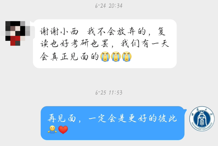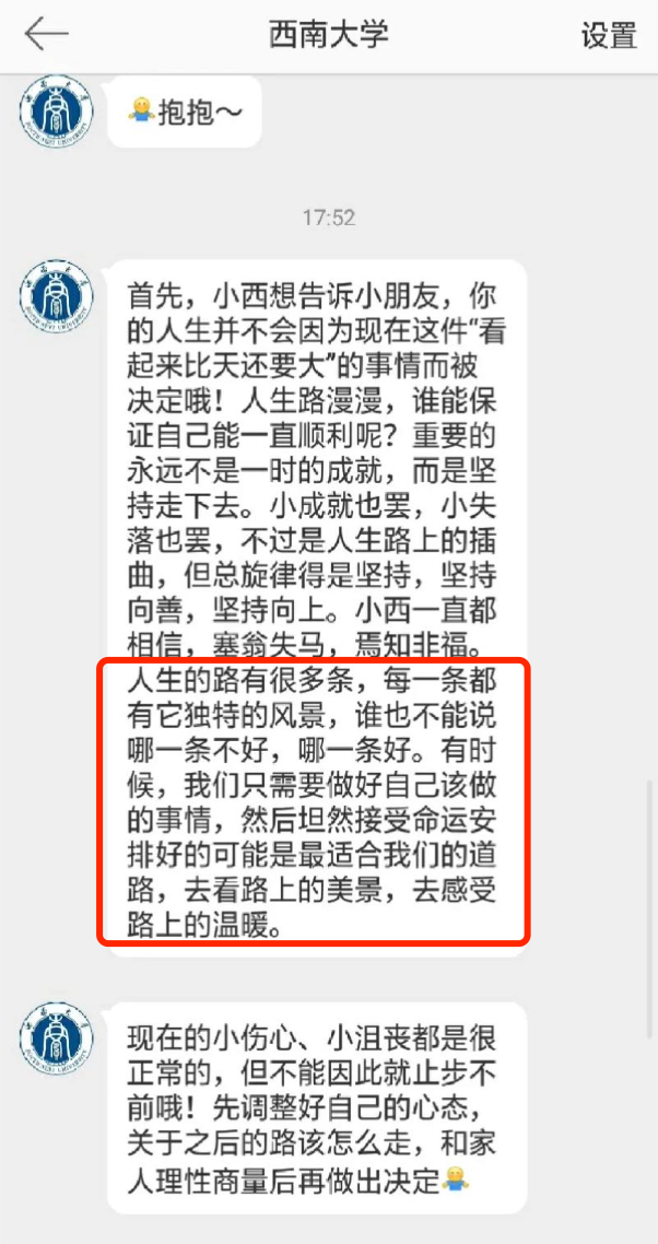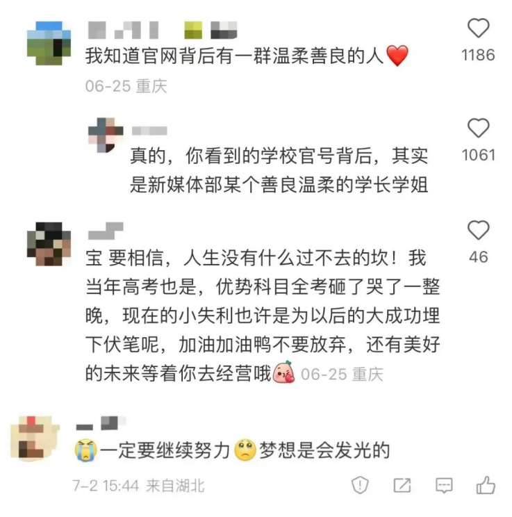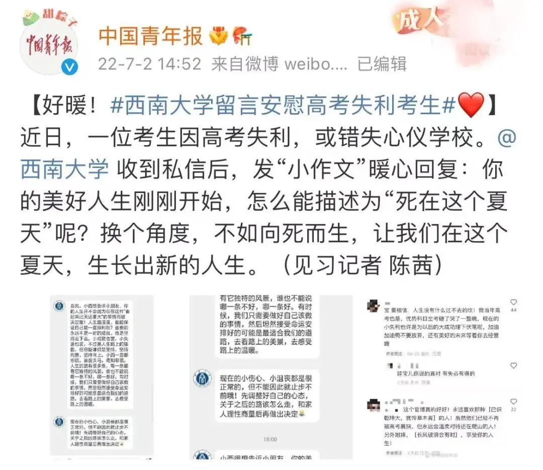 7月2日,一条主题为“金年会jinnianhuicom留言安慰高考失利考生”的微博引发了网友的关注,一名重庆考生高考失利,感受到巨大的心理落差后给学校官方微博留言,随即留言得到了微博运营团队同学的暖心回复,温暖的故事受到了人民日报、新华社、光明日报、央视新闻、中国青年报等媒体的广泛关注与报道,内容如下: