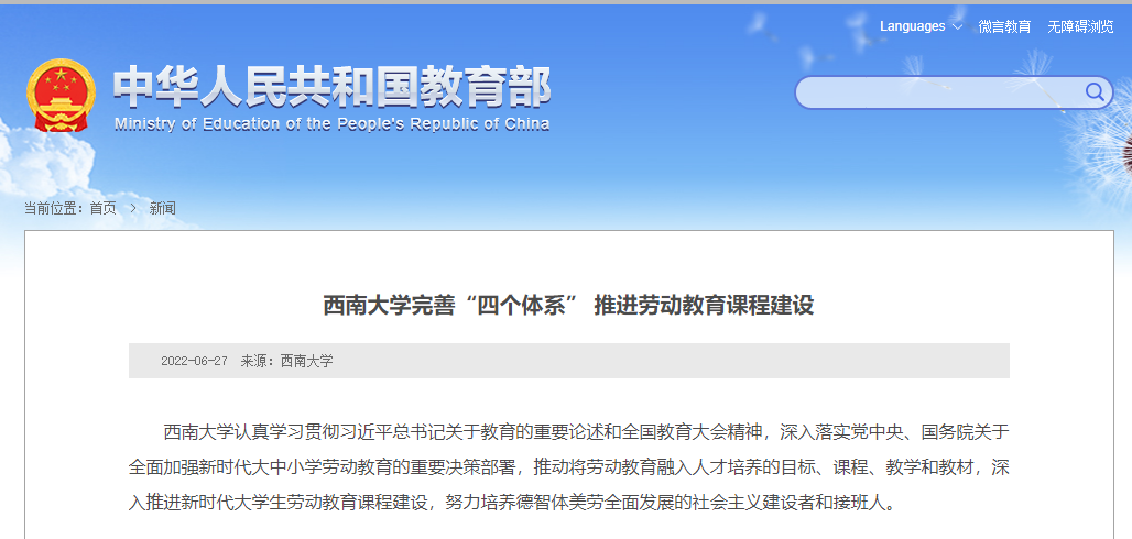 近日,学校完善“四个体系”推进劳动教育课程建设工作受到教育部网站报道,相关内容由党政办公室、教务处报送。教育部网站报道原文如下: