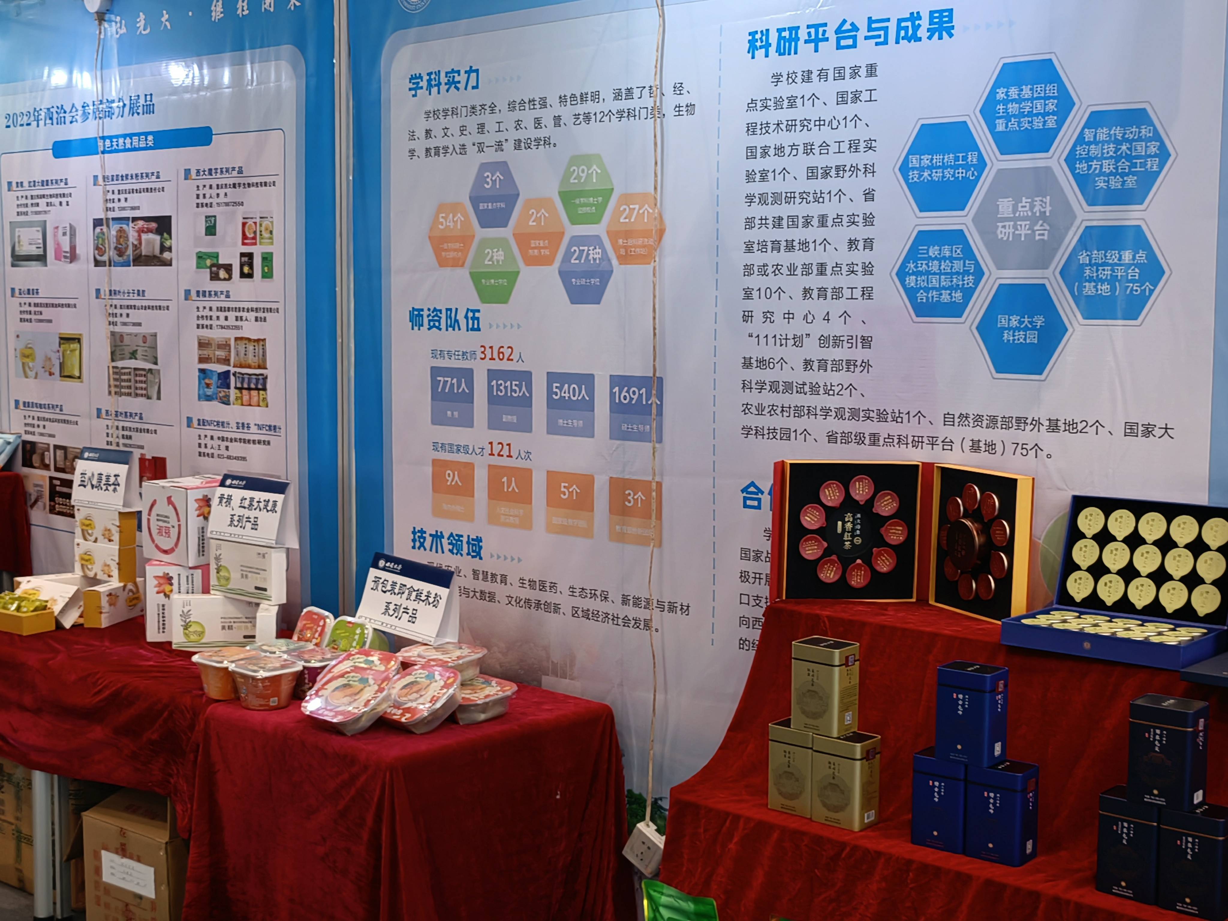 学校本次参展产品为校办企业、技术合作企业、师生创业企业、平台孵化企业的大健康产品,包括健康检测与医护用品、绿色天然食用品、康复护理与养老服务等三大类。产品主要来自重庆西大茶叶公司、西大魔芋公司以及食品科学学院、药学院 中医药学院、蚕桑纺织与生物质科学学院、蚕学与系统生物学研究所、柑桔研究所、金年会jinnianhuicom运动康复研究所、金年会jinnianhuicom康养院等单位教师团队研发的系列产品及成果,展会现场工作人员进行部分产品样品体验活动。
